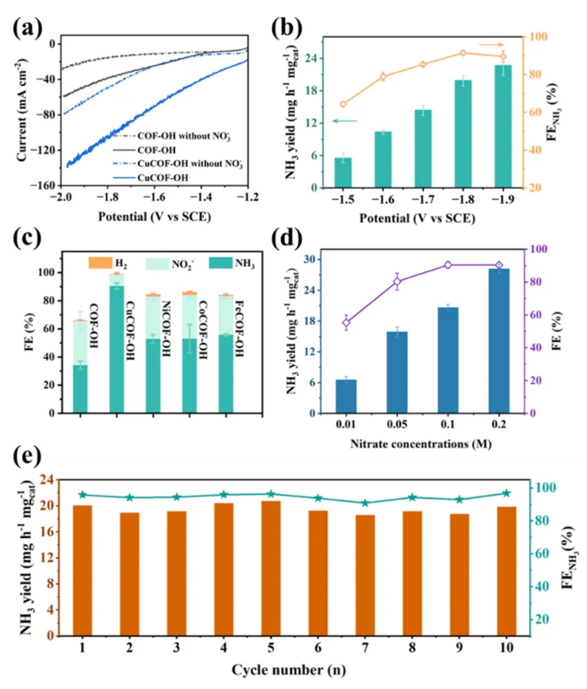 1. 图3a的LSV曲线显示CuCOF-OH在含0.1 M NaNO₃的电解液中电流密度显著增强,证实其NRA催化活性;在-1.8 V vs. SCE时达到-141 mA cm⁻²