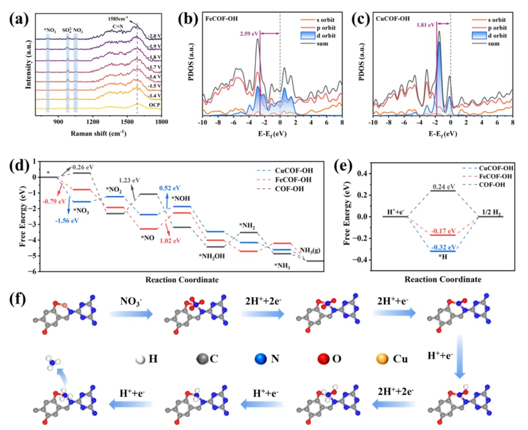 4. 原位拉曼和FTIR光谱揭示反应中间体(*NO₂、*NOH、*NH₂)的演化过程,CuCOF-OH上*NOH消耗峰更显著,表明*NO→*NOH加氢步骤动力学更快