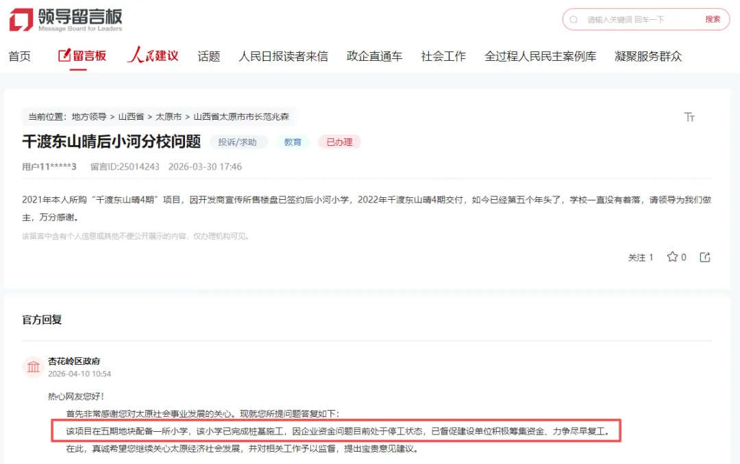 2021年本人所购“千渡东山晴4期”项目,因开发商宣传所售楼盘已签约后小河小学,2022年千渡东山晴4期交付,如今已经第五个年头了,学校一直没有着落,请领导为我们做主,万分感谢。