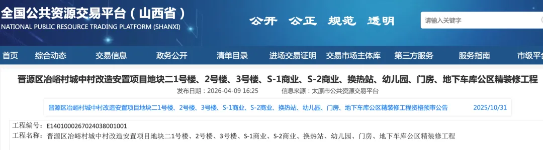 4月1日,全国公共资源交易平台发布了《晋源区冶峪村城中村改造安置项目地块一1号楼、2号楼、3号楼、4号楼、办公楼、垃圾转运站、换热站、生活水泵房、门房、地下车库公区精装修工程资格预审公告》。4月9日,全国公共资源交易平台发布了《晋源区冶峪村城中村改造安置项目地块二1号楼、2号楼、3号楼、S-1商业、S-2商业、换热站、幼儿园、门房、地下车库公区精装修工程》公告:建设规模:本项目位于太原市晋源区,西环高速以东、规划路以西、南中环以南、冶峪河快速路以北,总建筑面积126108.95㎡,地上建筑面积92897.95㎡,地下建筑面积33211㎡。