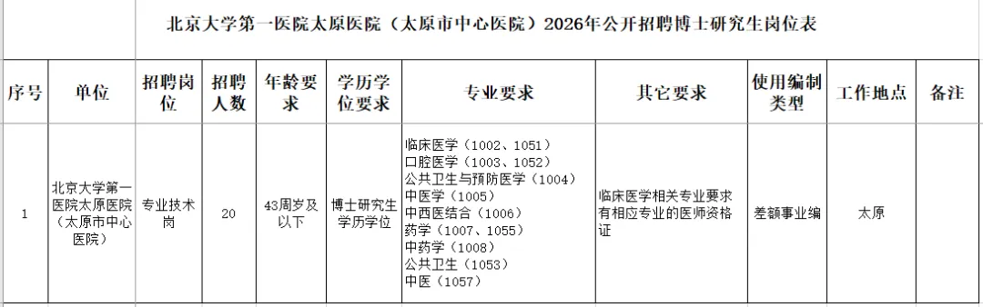附件:《北京大学第一医院太原医院(太原市中心医院)2026年公开招聘博士研究生岗位表》