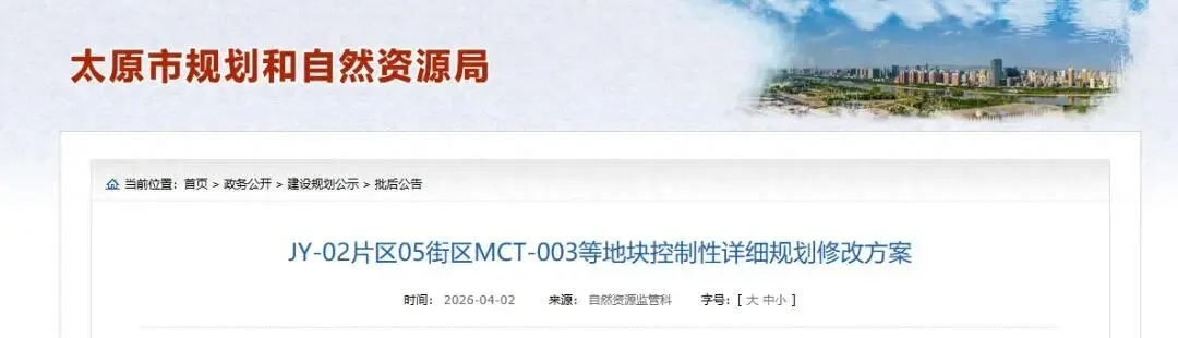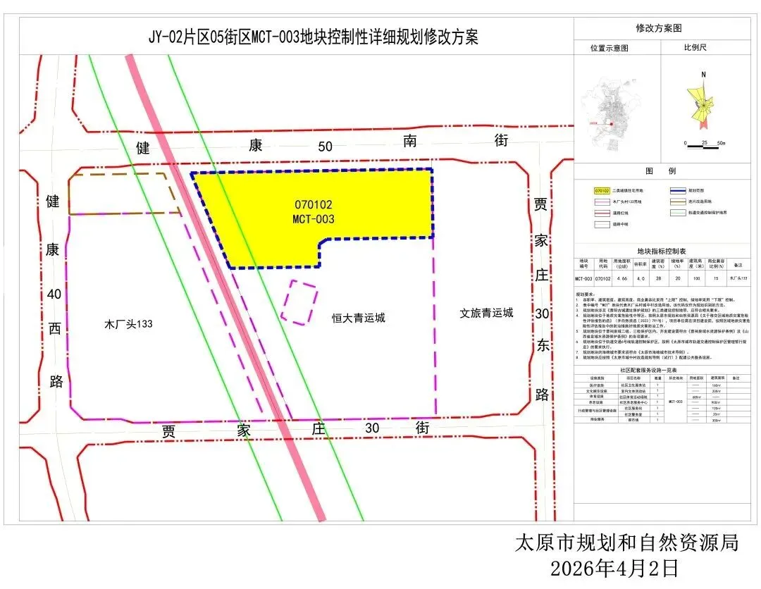 4月2日,太原市行政审批服务管理局网站发布了JY-02片区05街区MCT-003等地块规划公示。