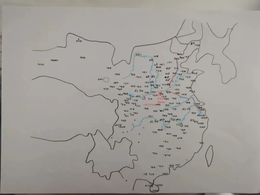 二月初四,邓州南阳县的朱粲也有几万兵力,他这人残暴得很,居然吃人,还自封“可达汗”,但这名号啥意思,从哪来的,没人知道。另外,贼寇萧铣在荆州州治江陵县起兵。于是任命华阳公郑元璹当太常卿,封沛国公,让他带兵从商山经上洛道出发,去平定南阳以东的各个郡。(图3蓝色)