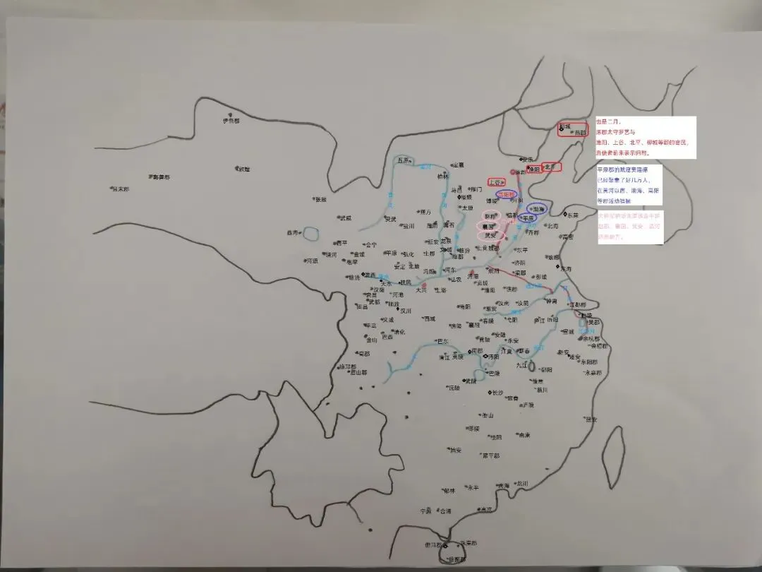 也是二月,涿郡太守罗艺与渔阳、上谷、北平、柳城等郡的官民,派使者前来表示归附。(图4红色)在这之前,平原郡的贼寇窦建德已经聚集了好几万人,在黄河以西、渤海、高阳等郡活动猖獗,十分嚣张。(图4蓝色)大将军府派张道源去平定赵郡、襄国郡、武安郡、清河郡这些地方,(图4粉色)可现在这些郡县都被贼寇占了,张道源也战死了。窦建德趁机自己称王,给自己的势力取名叫“夏国”。