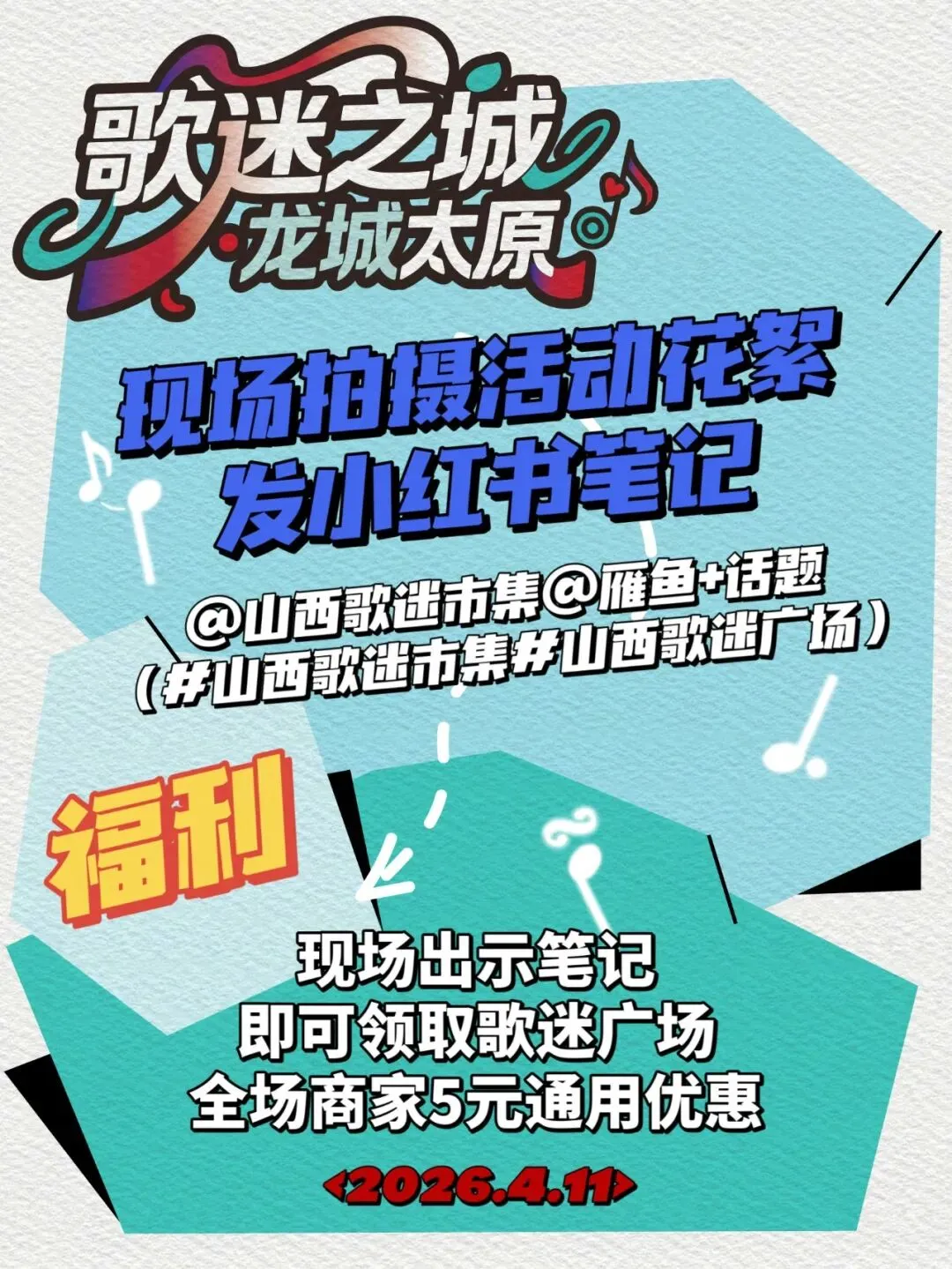 现场发布小红书笔记(@山西歌迷市集 @雁鱼文创 + 话题#山西歌迷市集#山西歌迷广场),或者关注“华舰体育”公众号,出示给工作人员,即可领取全场商家5元通用优惠券!吃喝玩乐,统统有优惠。