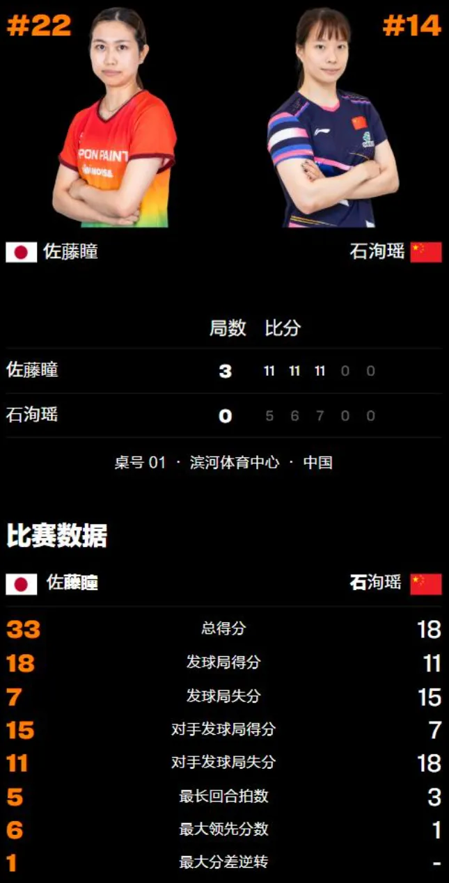 再看佐藤瞳,跟没事儿人一样,不紧不慢的。她都不用攻,光是正手反手换着削,一会儿转一会儿不转,就把石洵瑶晃得直丢分。11比5,第一局就这么没了。快得你都来不及反应。