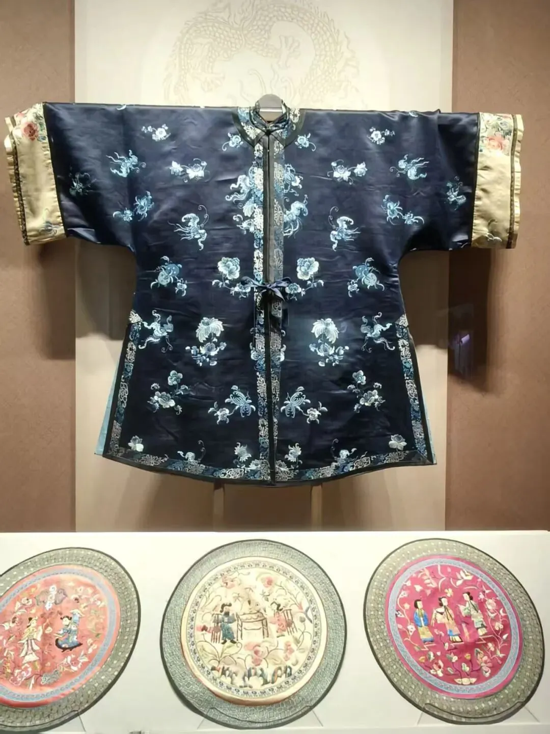 这是一种精致而华美的刺绣红。展柜里,那件靛蓝官服上的彩绣团花,以及下方陈列的刺绣团扇,红粉相间,针脚细密。这抹红,是山西匠人指尖的温度,是晋商文化里对生活美学的极致追求,展现了“三晋工艺,巧夺天工”。