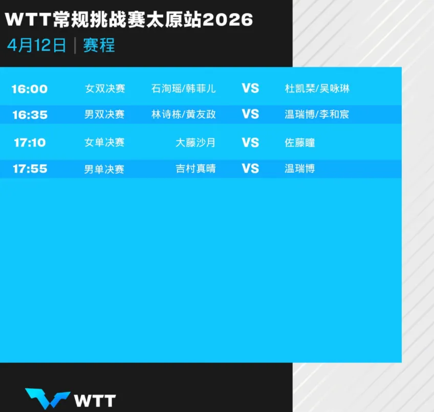 在刚刚结束的比赛日里,WTT常规挑战赛太原站的比赛上演了多场精彩的比赛。在单打比赛上,男单、女单的四分之一决赛上演后,随后而来的是男单、女单的半决赛。一番激战,最终的决赛名额出炉。在男单方面,国乒的19岁小将温瑞博突出重围,挺进决赛,他的对手是日本球员吉村真晴。在女单方面,日本队的两位选手大藤沙月和佐藤瞳争冠,国乒球员则无缘决赛。除了单打的比赛,在这一天还进行了男双、女双的半决赛,以及混双的决赛。在女双半决赛的一场比赛上,石洵瑶和韩菲儿组成的国乒组合击败了中国香港组合黄凯彤和苏籽童。在另外一场比赛上,中国香港组合杜凯琹和吴咏琳3-1击败了日本组合芝田沙季和高森爱央。在男双半决赛上,国乒的两对组合林诗栋/黄友政、温瑞博/李和宸分别晋级。林诗栋和黄友政3-1击败了队友陈垣宇和向鹏,温瑞博和李和宸击败了日本组合吉村真晴和吉村和弘,比分同样是3-1。在混双决赛上,黄友政/石洵瑶遇到了黄镇廷/杜凯琹,后者算是实力不俗而且配合非常默契的组合。就算是这样,国乒组合打得非常有侵略性,尽管中途出现小差池,但无碍最终的结果。11-7、11-9、6-11、11-7!国乒组合拿到赛事的首冠!北京时间4月12日,WTT常规挑战赛太原站的比赛将会来到最后一个比赛日。在这个比赛日里,男单、女单、男双、女双都会上演冠亚军之战。下面就来看看收官日的赛程吧!下午4点,女双决赛,石洵瑶/韩菲儿VS杜凯琹/吴咏琳;下午4点35分,男双决赛,林诗栋/黄友政VS温瑞博/李和宸;下午5点10分,女单决赛,大藤沙月VS佐藤瞳;下午5点55分,男单决赛,温瑞博VS吉村真晴。可以看到,温瑞博将会在近1个小时的时间里连续出战两场决赛,他也有可能全部拿下冠军。而黄友政则会冲击自己的第二冠,林诗栋要冲首冠。对了,本次比赛央视的体育频道依旧不会有直播!不管怎么说,国乒加油!
