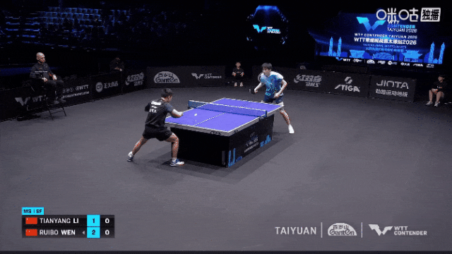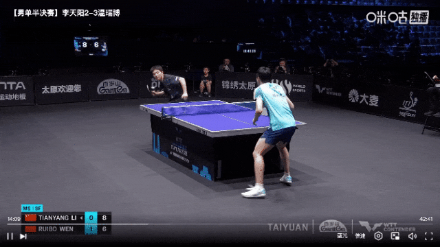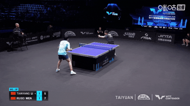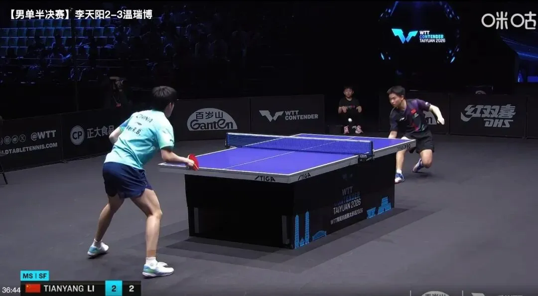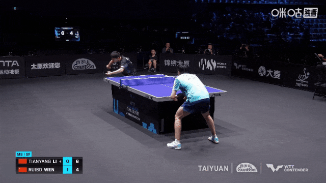 今天男单半决赛——温瑞博对阵李天阳这场,打得火星四溅,异常激烈,比赛结果:温瑞博以3-2险胜李天阳。5局比分:11-8,6-11,14-12,8-11,11-6(温瑞博在前)。首局上来,李天阳想要“故伎重演”——以正手进攻打开局面,结果前面几个球被温瑞博全防回来了,后面就老老实实削,机会出来再转进攻。局面上看,两个人处于均势,温瑞博千方百计找机会进攻,恨不得把李天阳打出场外。李天阳反手削得挺稳,温瑞博加力冲就下网。关键球,温瑞博进攻打开了局面。第2局,李天阳开启了自己的表演赛,先让温瑞博吃个发球,自己反手还能倒板连续拍,同时,正手进攻再拿一两分。这一顿操作下来,给温瑞博都打蒙了。有一说一,李天阳发球真的太好了,发球直接得分的情况,几乎每局都会有。比如下面这种:比赛转折点在第3局,李天阳在后半局领先很多,结果打得太保守,削得太多,自己进攻没打出来,被温瑞博翻盘。第4局,李天阳稳扎稳打,攻削结合,通过不断变化来打乱温瑞博的进攻节奏。温瑞博失误连连,李天阳乘机又拿下一局。决胜局,5-5后,大心脏的温瑞博连续用正手进攻打开了李天阳的防线,一波流拉开了场上的比分,李天阳回天乏力,决胜局11-6,小温锁定胜利。这场比赛,总体上看,小温打得一如既往地好,但李天阳打得也不差。李天阳的黑马之旅暂时告一段落。连续看了李天阳3场球,这名国乒新秀确实给人巨大的惊喜。说实话,他的打法风格太特别了,像削球又不像削球,像攻球又不像攻球,相信第一次跟李天阳对阵的选手都不太能适应这个节奏。国乒好好培养培养李天阳,这小伙以后能成为对付外协的奇兵。说不定,哪一站比赛就冲出来了呢。最后,恭喜国乒新秀温瑞博晋级WTT太原常规挑战赛男单决赛。