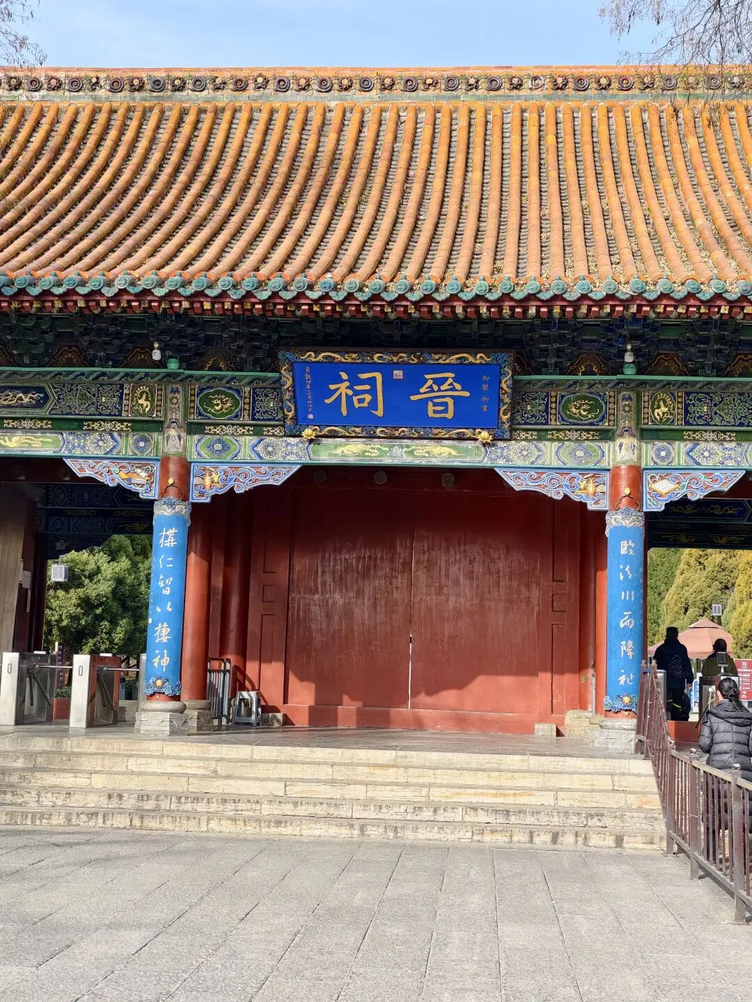 进入晋祠需要穿过两座大门。刚走进第一块挂有御制御书“晋祠”牌匾的大门时,我们以为已进入晋祠,当看到里面只是一片开阔,分布着一些现代仿建的亭台楼阁,像个普通公园,不免有些失望。后来才知道,这本身就是一个配套的公园,叫晋祠公园。直到走进第二块由陈毅元帅题写“晋祠”牌匾的大门时,才算是真正进入晋祠古景区,名为“晋祠博物馆”。