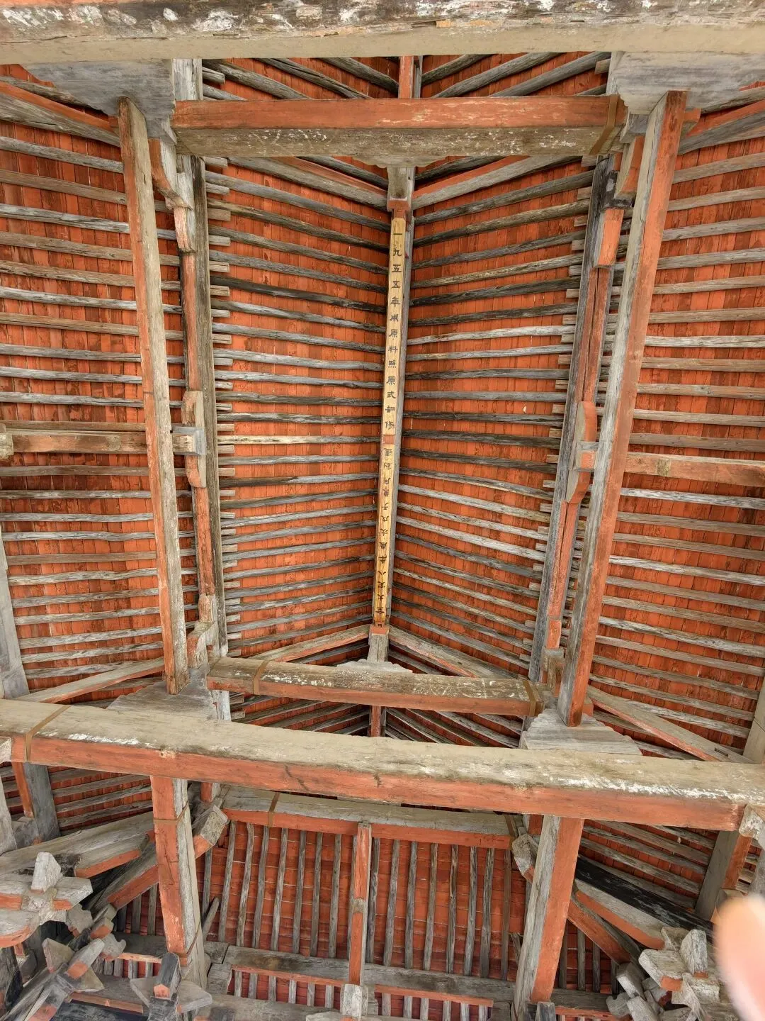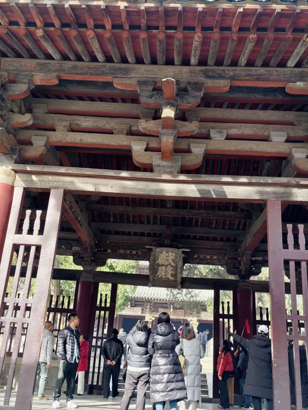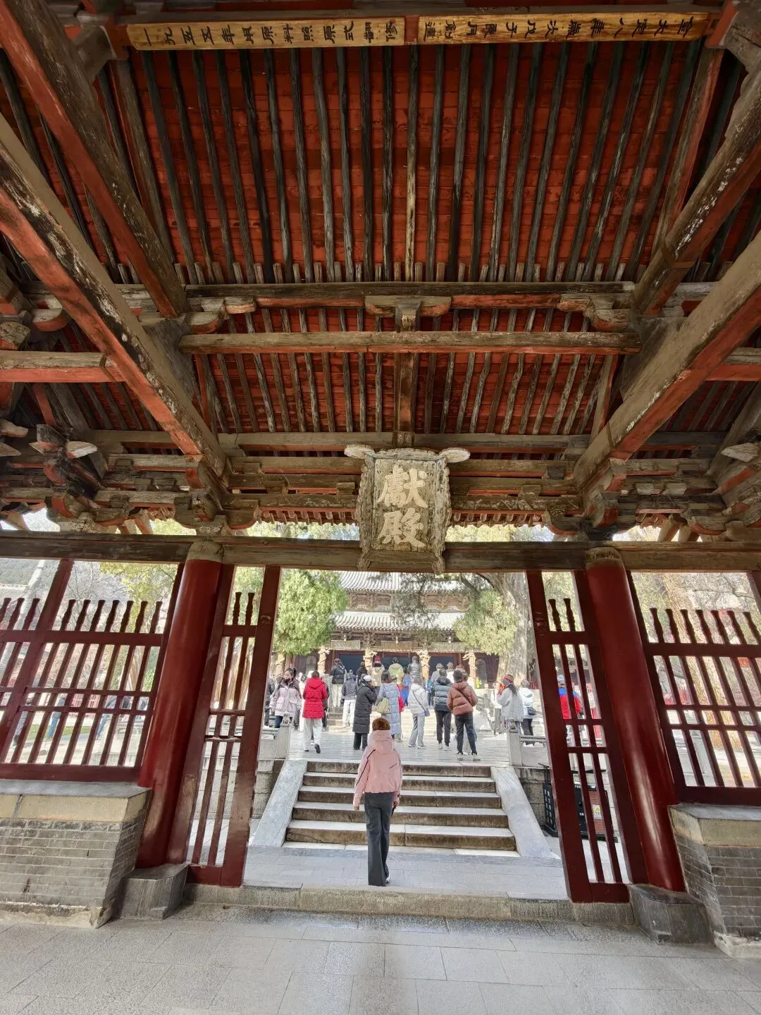 三座国宝级建筑都坐落在晋祠的中轴线上。顺着步道游览,最先遇到的是献殿。这座金代落成的建筑采用全榫卯结构,整座大殿没有一颗钉子,1955年曾按“用原料照原式翻修”的原则进行翻修,这个细节被记载在大殿房梁之上。(这种榫卯结构我最近在福州的华林寺和宁波的报国寺都见过,它们都是宋代建筑技艺的典型代表。)