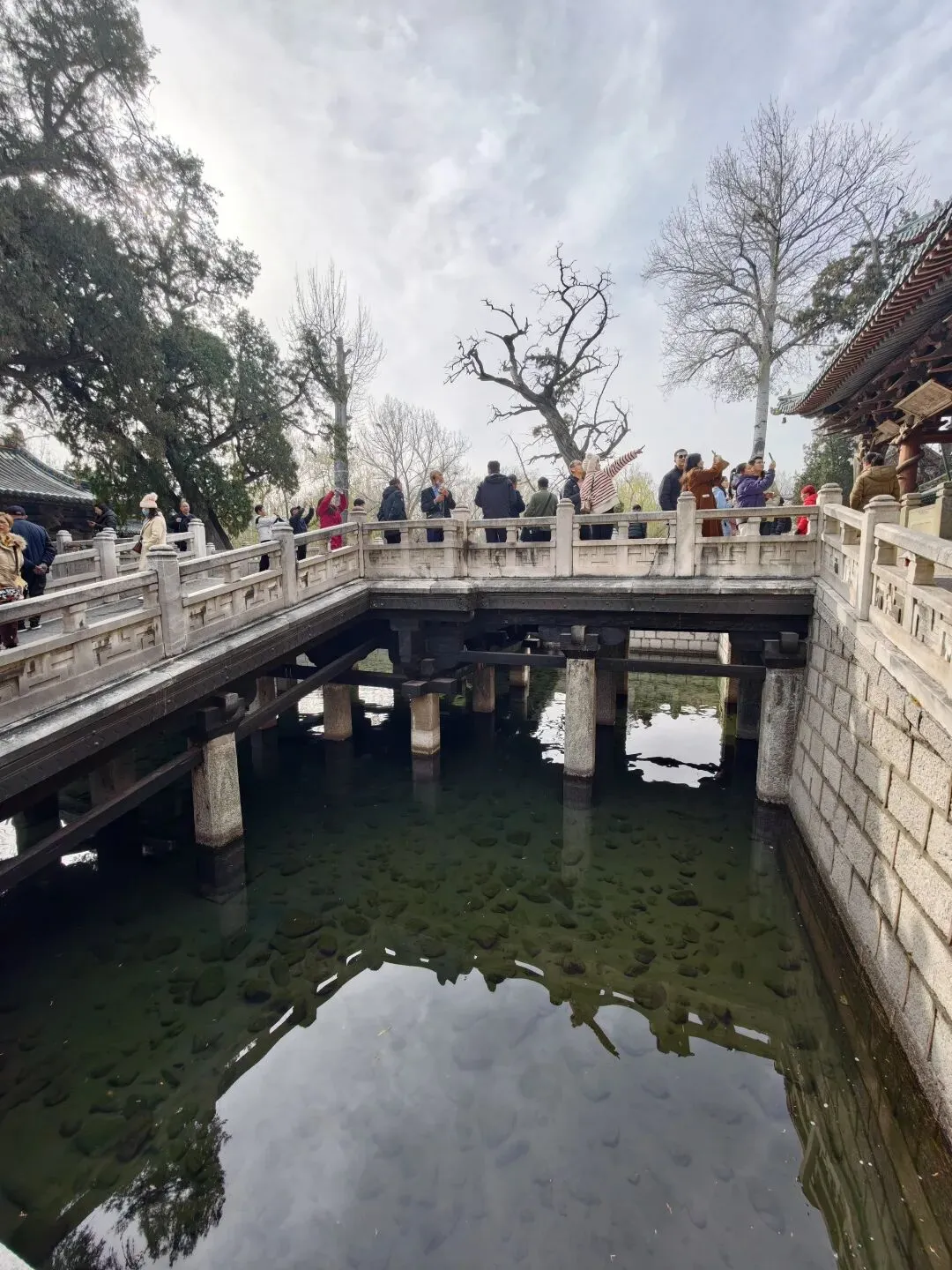 鱼沼飞梁连接着献殿和圣母殿,是一座十字形石桥,可以通达四个方向。整座桥的桥面由立在沼内的34根石柱支撑,号称是最早的十字形“立交桥”,设计之巧令人称奇。