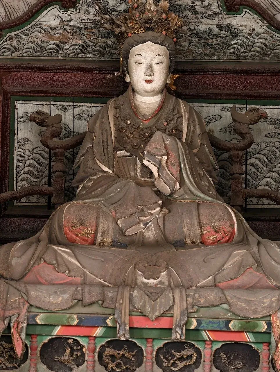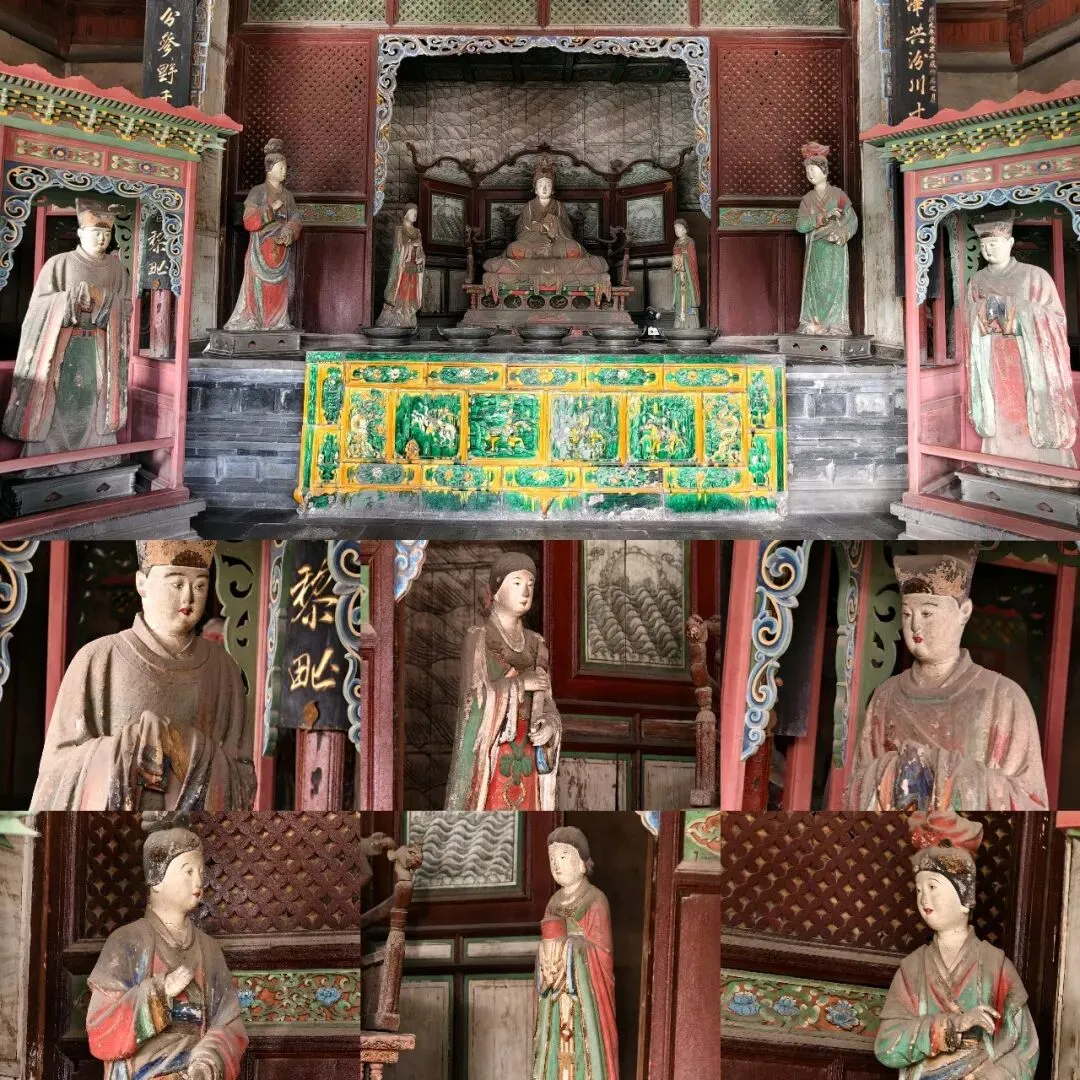 走过鱼沼飞梁,就来到了圣母殿~一座位于晋祠的最深处的主殿,殿中供奉的是圣母邑姜。整个大殿从外形上看显得非常气派,在殿身正面前檐的8根柱子上雕刻着盘龙。走进殿内,伫立着四十多尊彩塑。正中间端坐的是圣母邑姜,两边分立着女官、宦官和侍女等人物。这些彩塑的色彩至今保存得相当完整,人物塑造也给人一种真实生动的感觉,仿佛在无言地诉说着那久远的故事。
