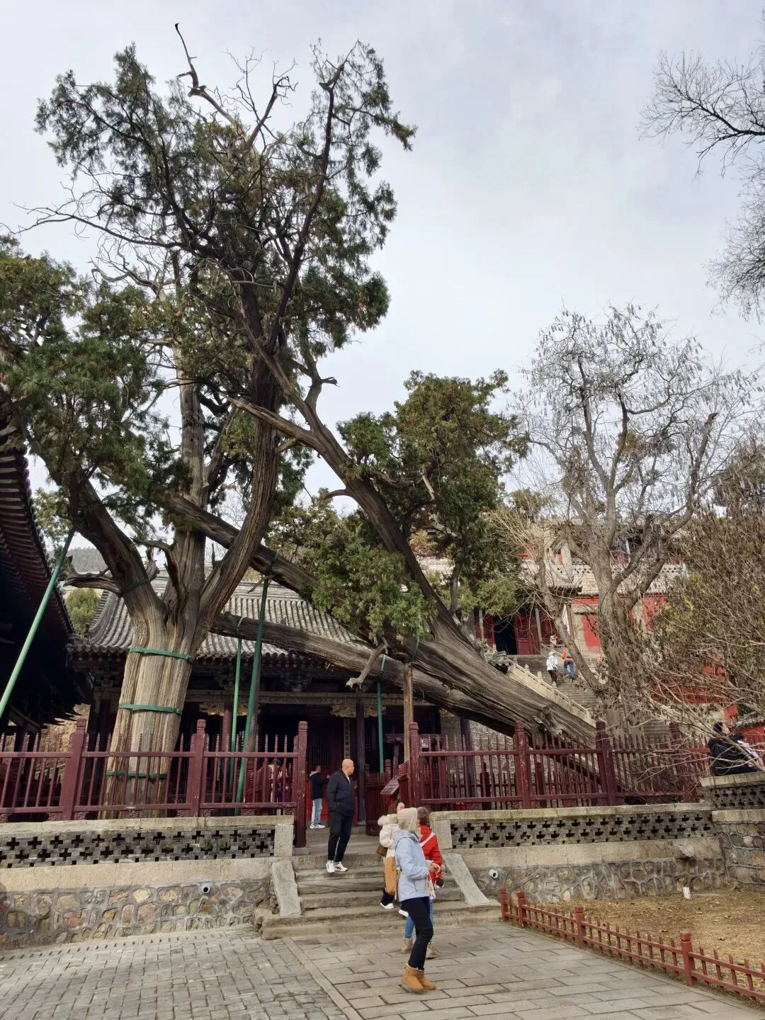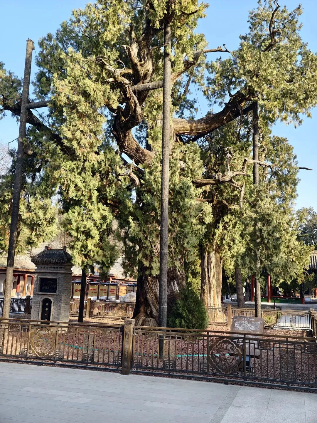 在游览过程中,“晋祠三绝”里的“周柏”最让我心有所感,毕竟前不久我才刚去过延安黄帝陵,拜谒过黄帝手植柏2025云贵行第二十四站:陕西延安黄陵轩辕庙。我不禁将两棵千年古柏放在一起对比,发现差别还挺明显:黄帝手植柏笔直挺拔且粗壮,而这棵周柏呈侧卧状,半躺半立,树干比手植柏稍细一些。后来我查到具体数据,黄帝手植柏下围周长有11米,晋祠周柏的胸围则约为8.2米。虽然两者形态粗细不同,但站在古树旁,那种震撼却是相通的:历经几千年风雨依然生生不息,这份生命力足以让人为之动容。