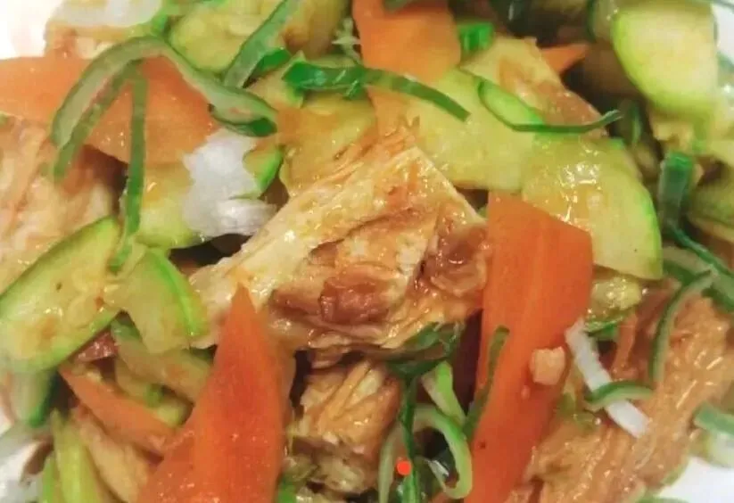 副食:干炸鱼块、西葫芦杏鲍菇炒火腿、红烧豆腐、炒小白菜