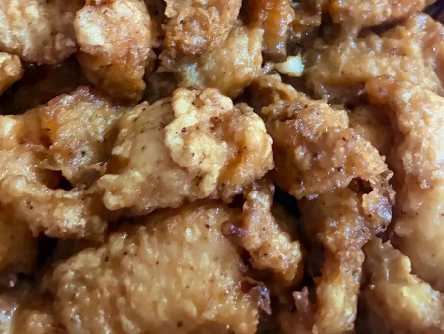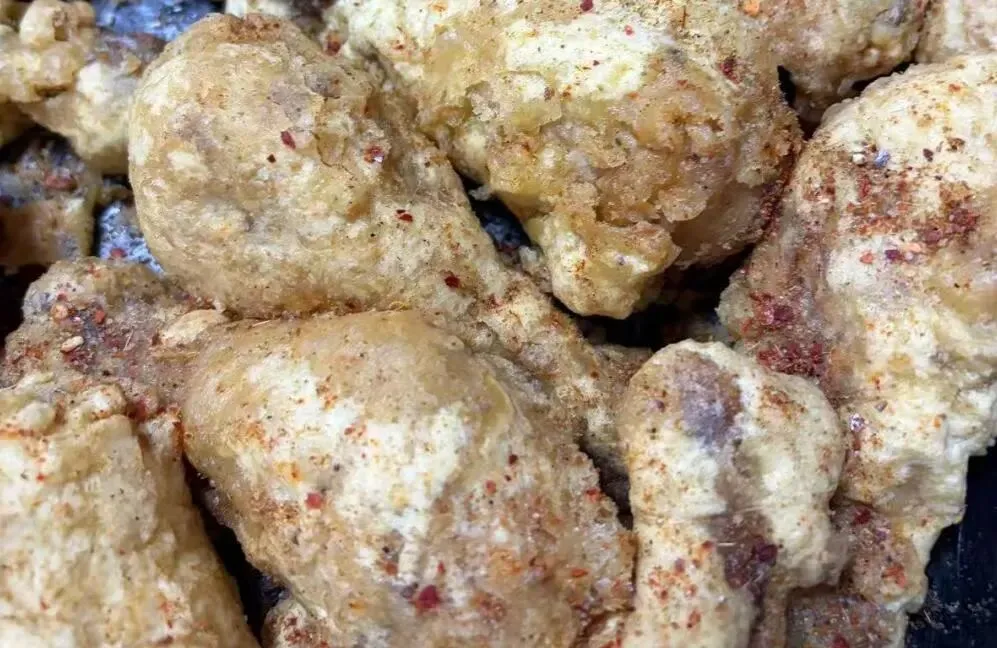 副食:红焖鸡腿、青椒炒肉丝、炸鸡柳串、烧平菇油菜