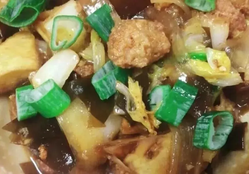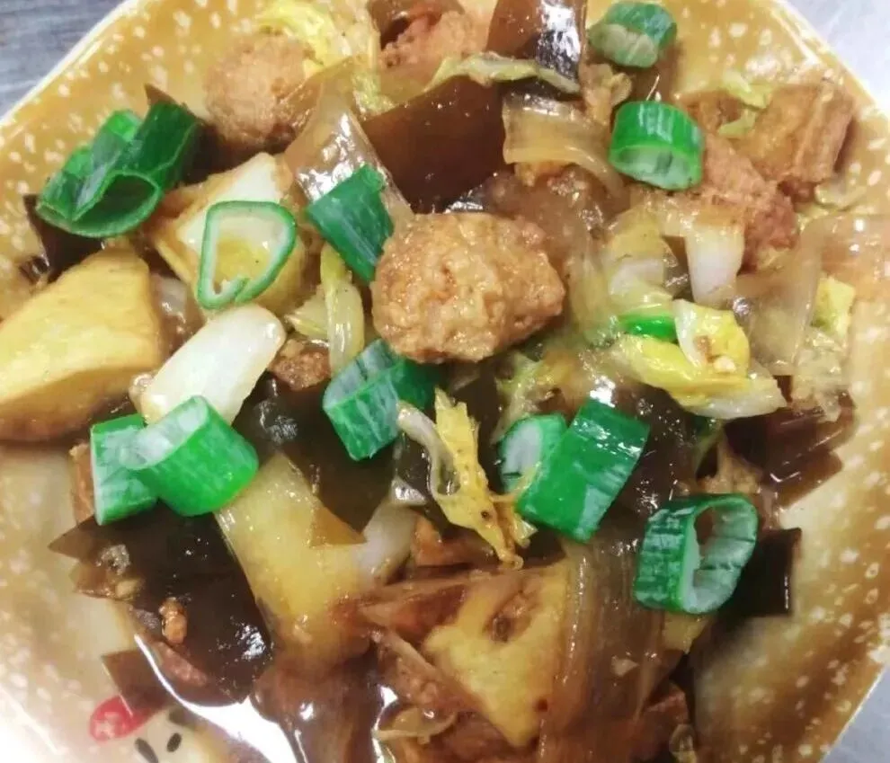 副食:丸子肉烩菜、尖椒土豆丝、脆炸洋葱卷、蚝油生菜