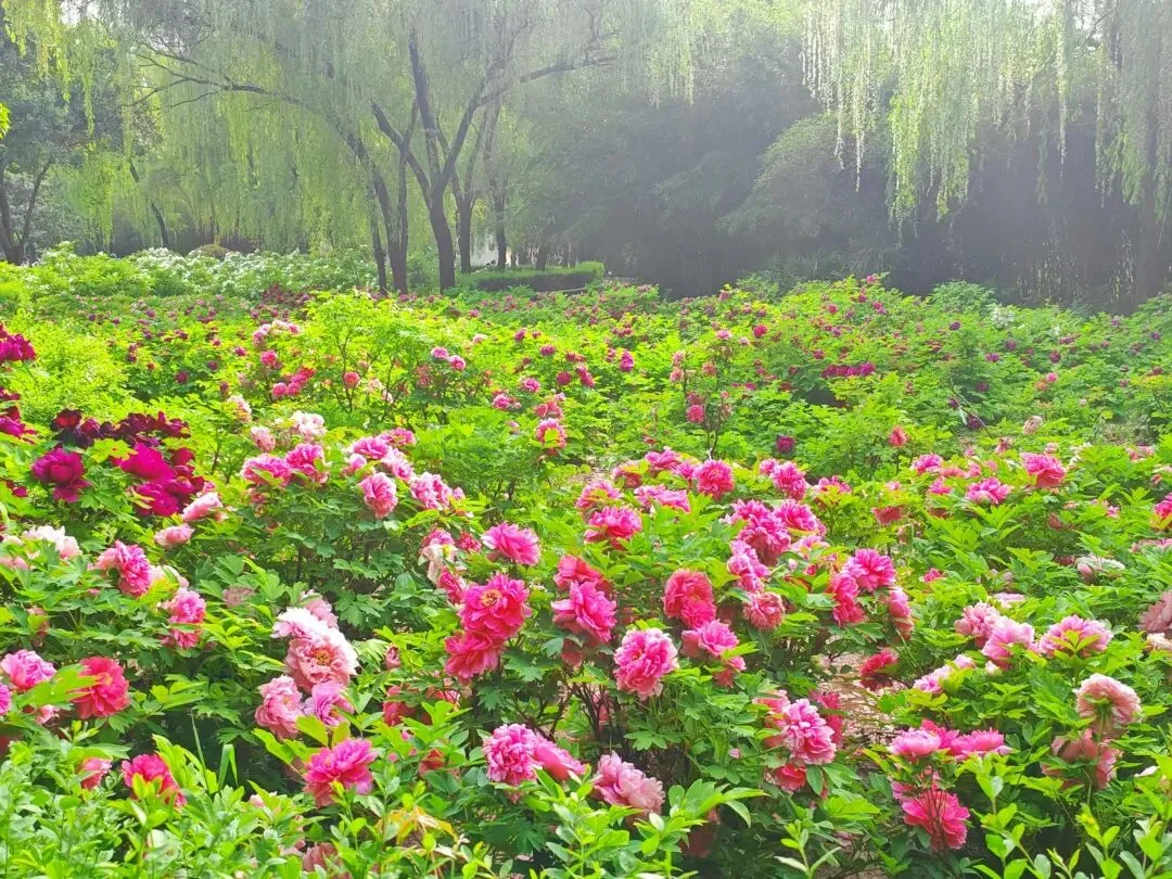 园内牡丹品类之盛、名品之多,堪称北方牡丹宝库。园区精心引种栽培150余种牡丹,涵盖中原牡丹、西北紫斑牡丹两大核心品类,集齐红、粉、白、黄、紫、绿、黑、蓝、复色九大色系,荷花型、皇冠型、绣球型等十大花型一应俱全。从传世名品到珍稀新种,从传统名花到特色植株,应有尽有。“花王”姚黄光彩照人,清雅高贵;“花后”魏紫花瓣层叠,雍容华贵;赵粉温婉柔美,粉嫩可人;豆绿清新脱俗,罕见珍稀;鲁荷红热烈奔放,艳冠群芳;紫斑牡丹粗犷奔放,耐寒耐旱,尽显西北牡丹的原始野性。一株株名品各展风姿,或端庄大气、或灵动娇俏,构成一幅五彩斑斓的牡丹长卷。