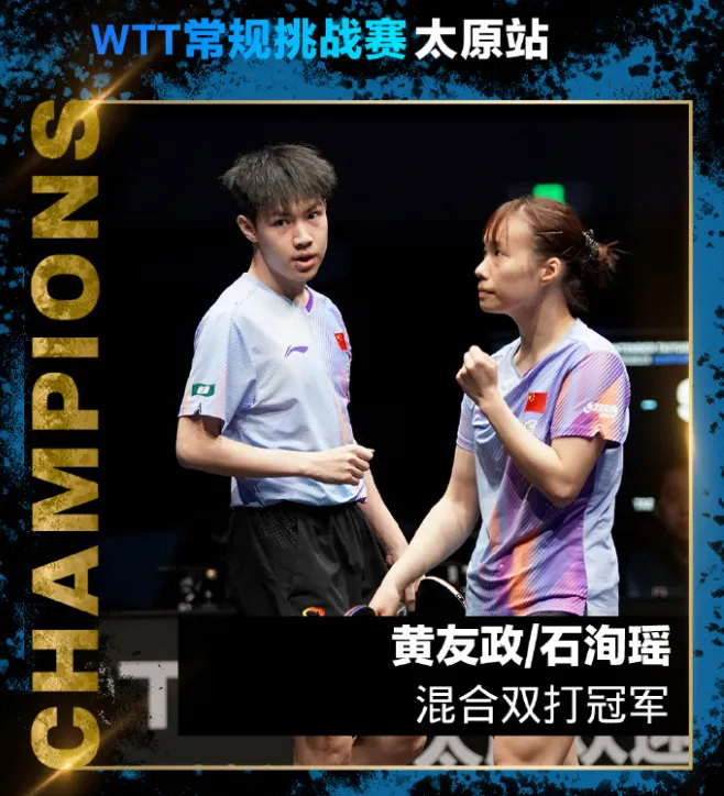 混双决赛中,国乒组合黄友政/石洵瑶迎战经验丰富的中国香港组合黄镇廷/杜凯琹。首局,黄友政/石洵瑶凭借接发球拧拉的优势以5-1开局,并以11-7先声夺人。第二局两人一路领先,10-5拿到局点后对手连追4分,国乒教练徐辉果断叫停,暂停回来黄友政/石洵瑶以11-9再下一城。第三局黄镇廷/杜凯琹以11-6扳回一局。第四局,国乒组合重新掌控节奏,以11-6锁定胜局,总比分3-1夺得混双冠军。