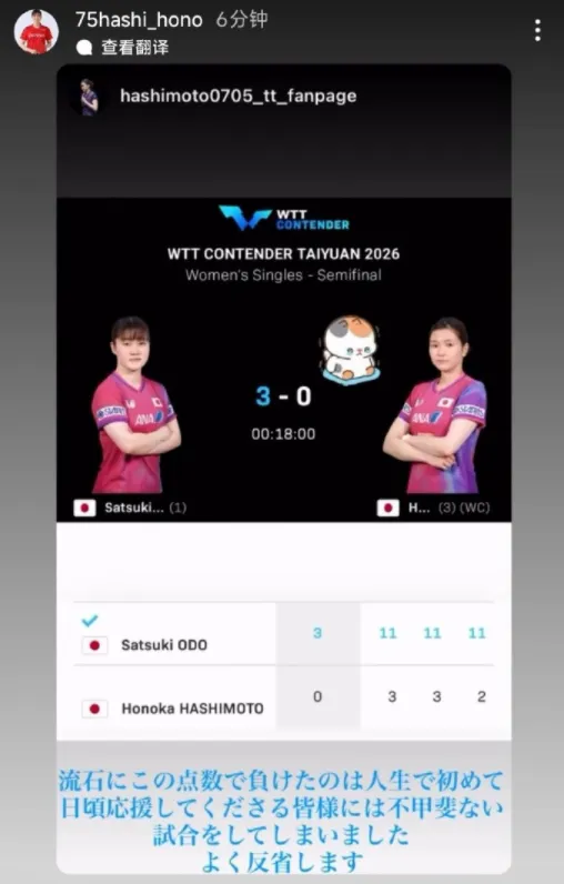 赛后,桥本帆乃香在社交媒体上发文回应了这场惨败。她写道:“人生中第一次以这样悬殊的比分落败,为了不辜负一直以来支持大家的各位,我打出了这场不尽如人意的比赛,我会好好反省的。” 这位日本削球手坦诚面对失利的态度,赢得了不少球迷的尊重。