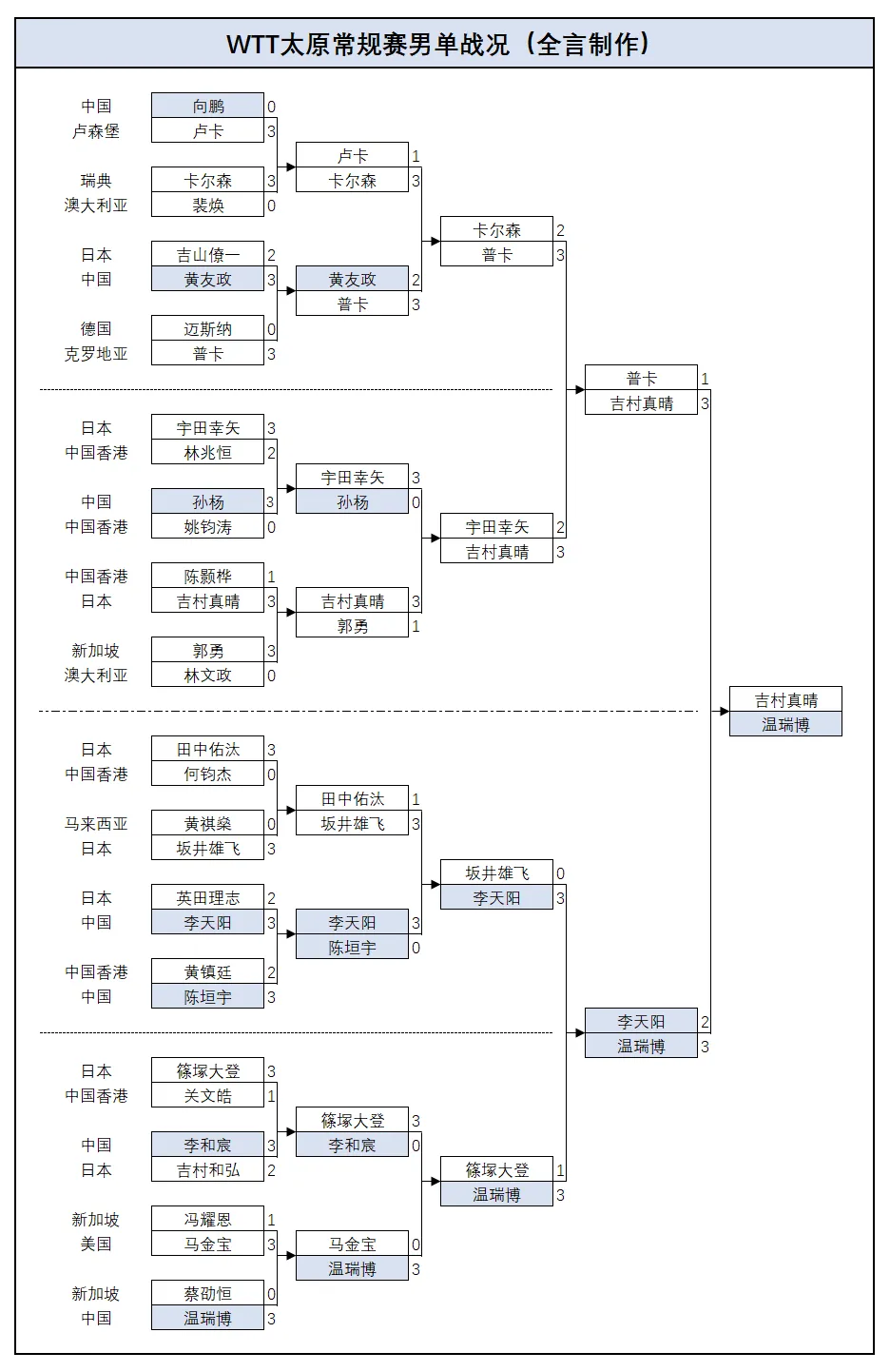 本站比赛国乒有7位运动员参加男单项目,结果温瑞博、李天阳2人晋级8强与4强,随后在半决赛爆发内战,双方激战5局后才分出胜负,温瑞博3-2惊险过关;日本虽然有4人入围8强,但只有世界冠军老将吉村真晴晋级半决赛,随后他3-1逆转克罗地亚的普卡赢得决赛门票。