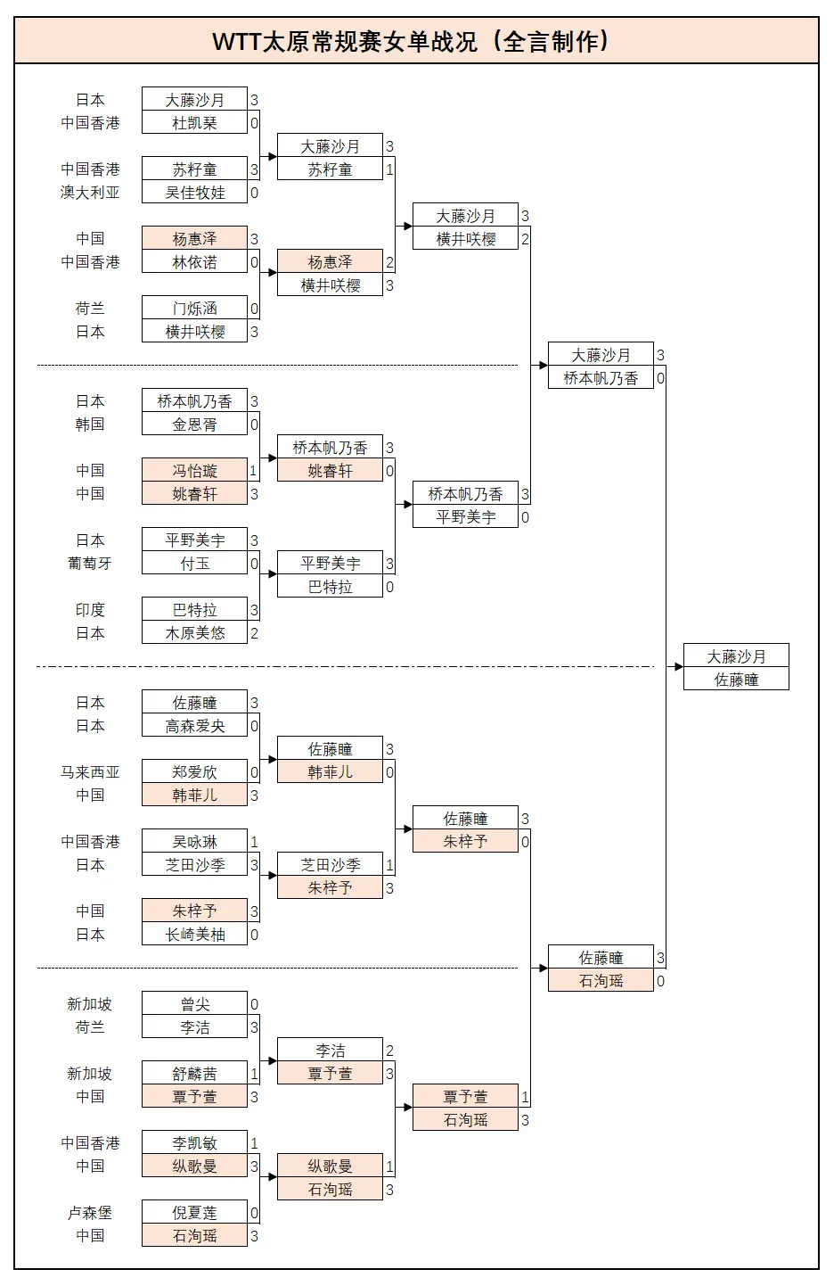 女单方面,国乒14位队员中的6人早在资格赛就出局,随后3人晋级8强,但只有石洵瑶1人入围4强,但她很快便0-3不敌日本削球手佐藤瞳(此前韩菲儿、朱梓予也是0-3输此人),另一场半决赛则是大藤沙月3-0横扫削球打法队友桥本帆乃香,接下来将与佐藤瞳一较高下。