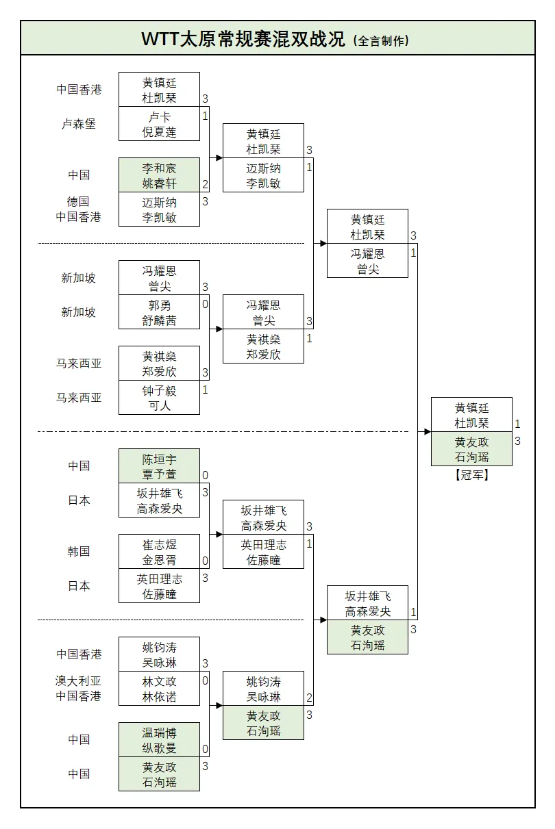 混双方面,国乒在首轮就输掉3对选手的情况下稳住阵脚,最终黄友政/石洵瑶晋级决赛并3-1击败中国香港的黄镇廷/杜凯琹夺冠;男双国乒外战全胜,林诗栋/黄友政、温瑞博/李和宸会师,提前包揽冠、亚军;女双石洵瑶/韩菲儿闯入最后一轮,即将对阵中国香港的杜凯琹/吴咏琳。