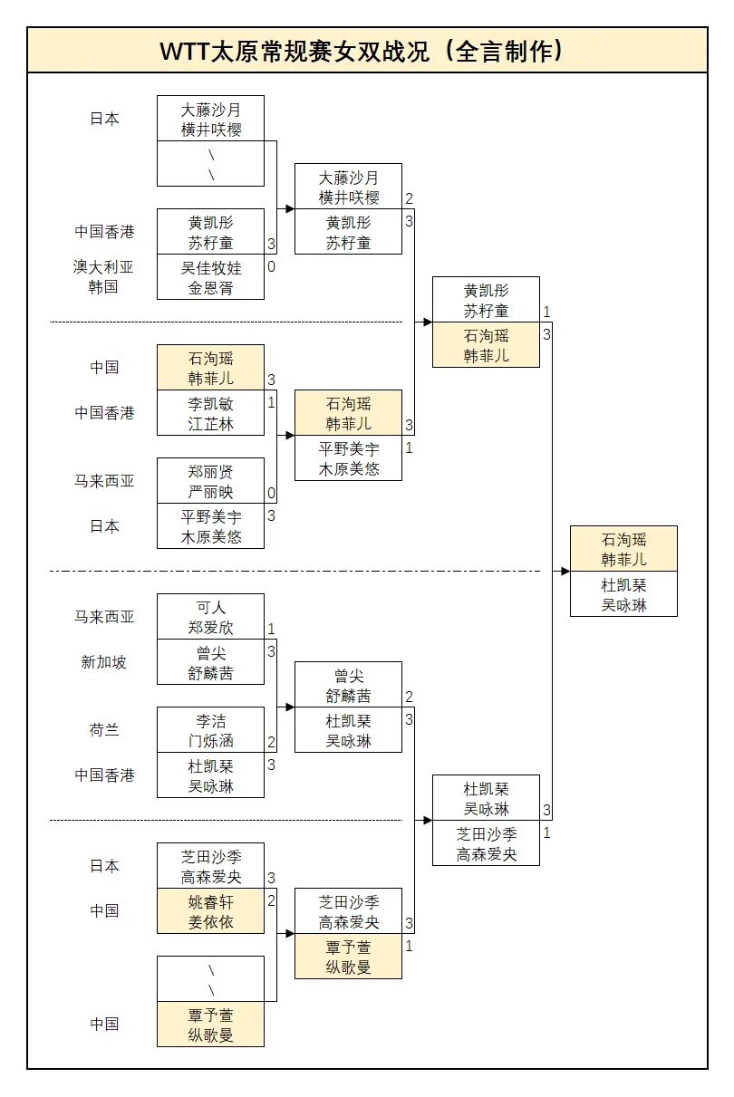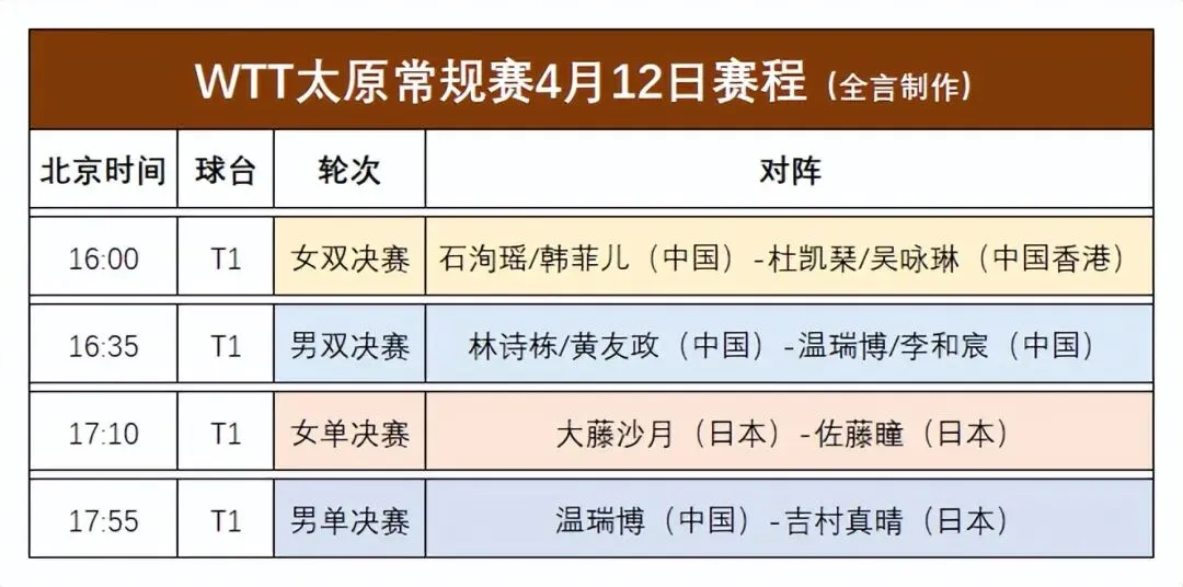 接下来WTT太原常规赛的最后4场决赛将在4月12日依次进行,出场选手全部来自中日两国,具体安排如下: