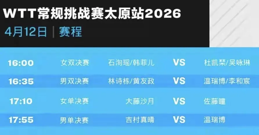 4月12日,本站赛事将迎来终极决战,国乒多点冲冠,温瑞博、石洵瑶等小将能否再夺金牌,让我们共同期待。