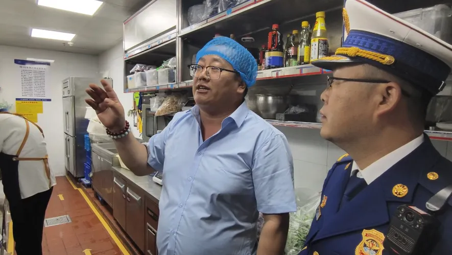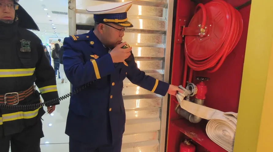 理论教学结束后,消防人员对商场餐饮区域进行了安全隐患检查,随即启动疏散逃生演练。