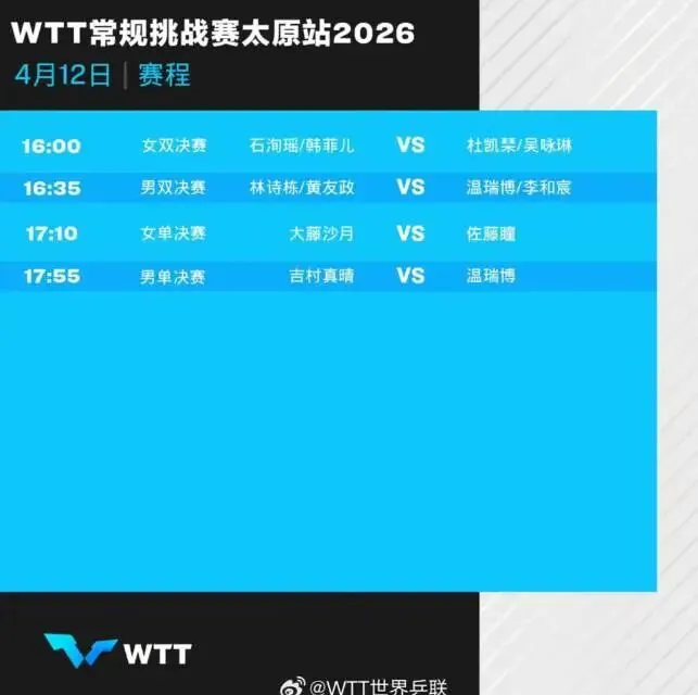 >4月12日WTT太原常规挑战赛赛程发布