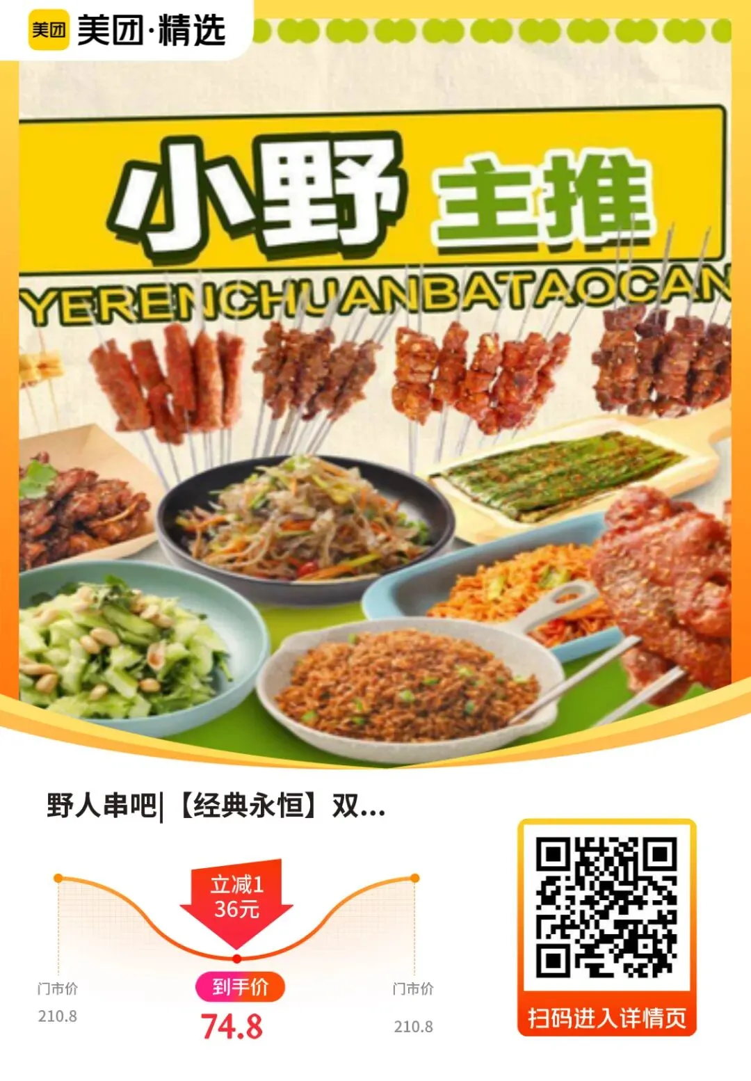 【野人串吧太原街】经典永恒双人套餐特惠价74.8元,3.6折