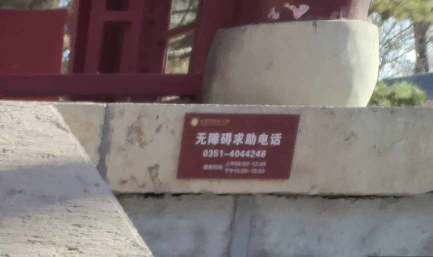 无障碍设施:主要游览路线设无障碍坡道,关键台阶旁有求助电话提示牌(电话:0351-4044248)。