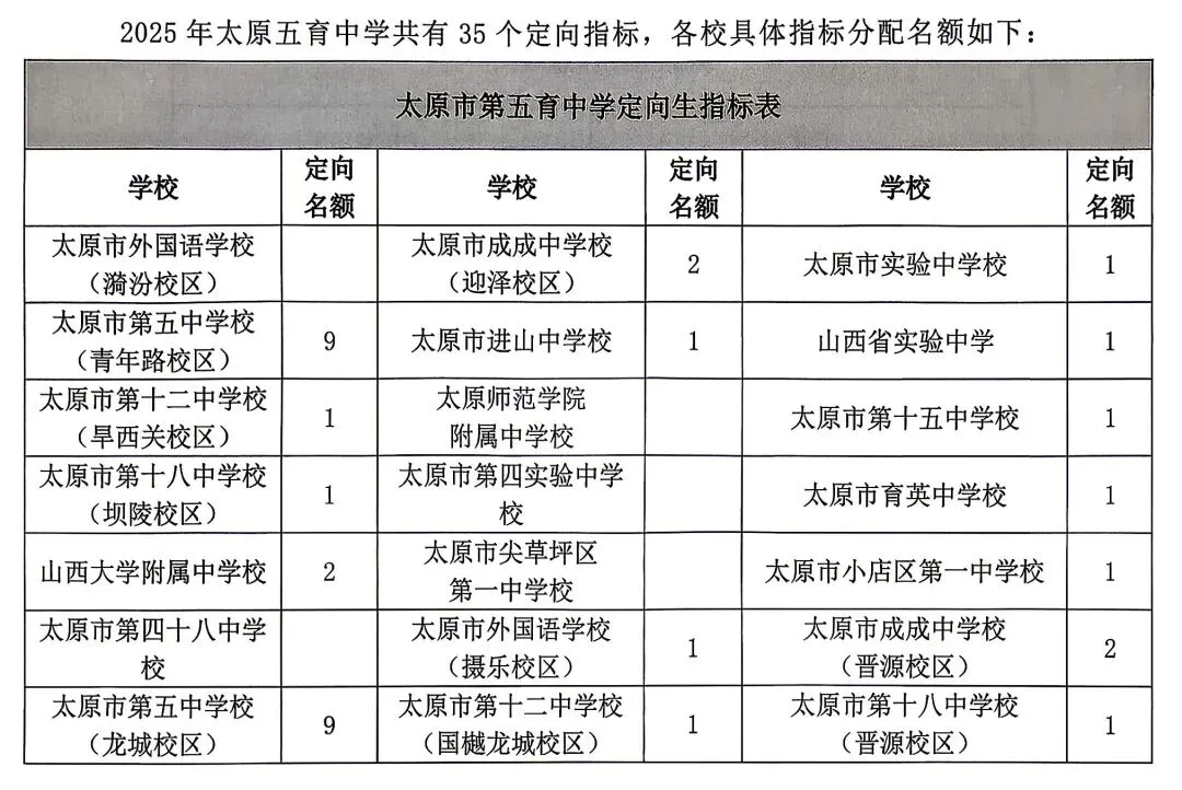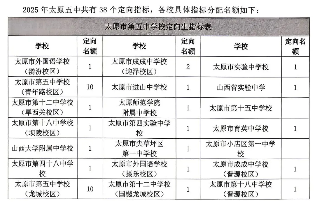 定向指标是太原中考升入优质高中的重要通道,2025年分配如下: