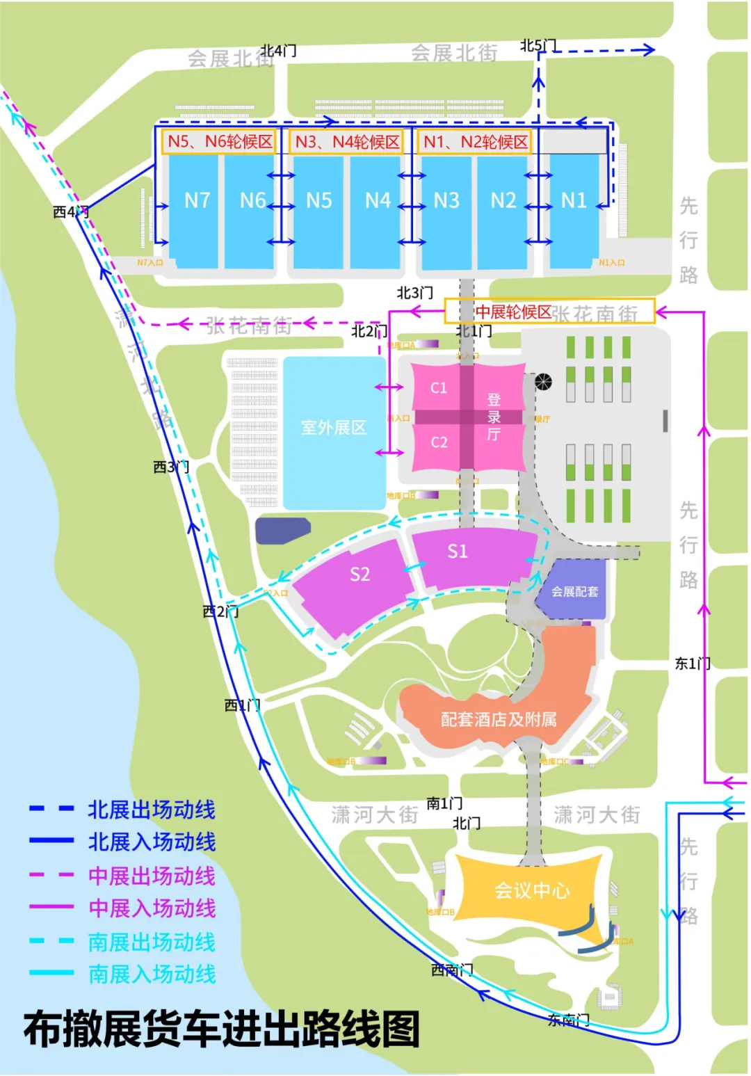 C、南展(S1馆-S2馆,图上标注为浅蓝线条):潇河大街—潇河北路—西2门进入;