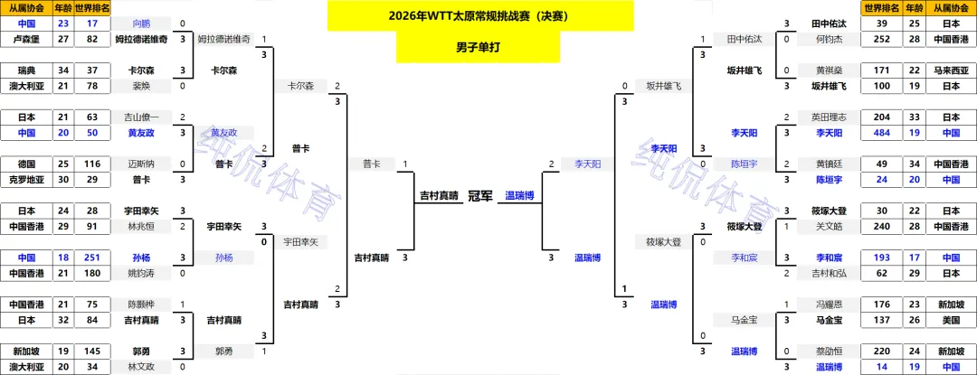 北京时间4月12日,2026年WTT太原常规挑战赛进入最后一个比赛日的争夺,目前男、女单决赛名额已经出炉(签表详情见如下图表)!国乒单打参赛21人仅剩男单19岁新星温瑞博一人,国乒女单参赛14人更是全军覆没,下面带来详细信息。
