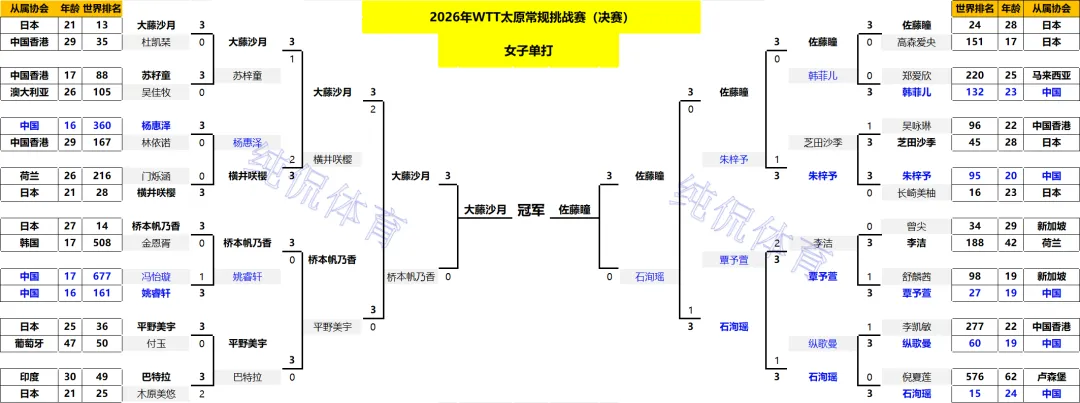 女单1/4决赛,覃予萱和张梓予二人输球出局,覃予萱1-3不敌队友石洵瑶;张梓予0-3不敌日本削球选手佐藤瞳;来到女单半决赛,赛会女单二号种子石洵瑶,同样以0-3的比分完败于日本选手佐藤瞳,至此国乒女单参赛14人全军覆没。