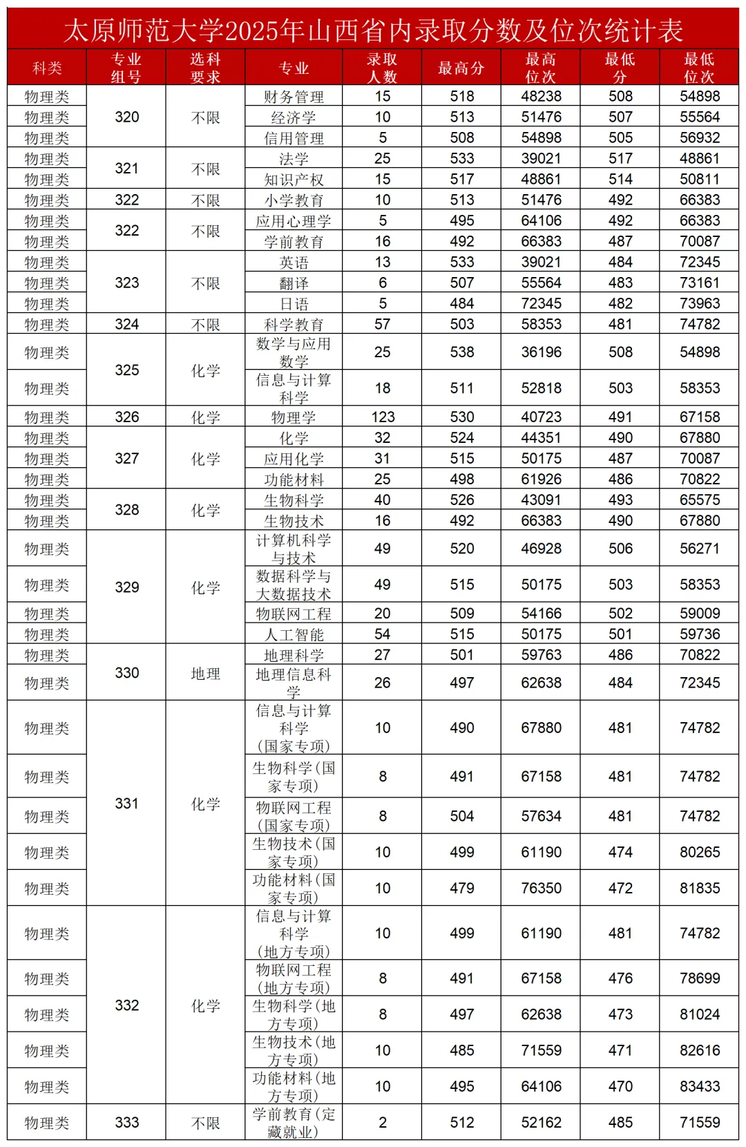 - 师范类专业持续领跑无论历史类还是物理类,师范类专业(汉语言文学、数学与应用数学、小学教育等)始终是录取分数最高、生源质量最好的专业,是太原师范大学的核心优势。