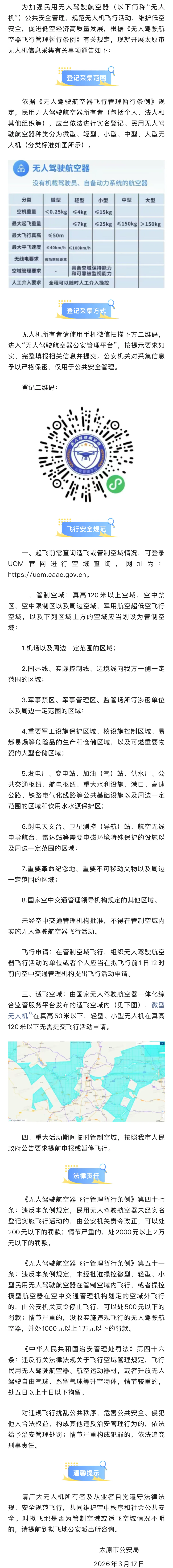 太原市公安局已于3月17日发布通告,要求全市民用无人机完成实名登记,未登记飞行将面临罚款,情节严重还可能被拘留!