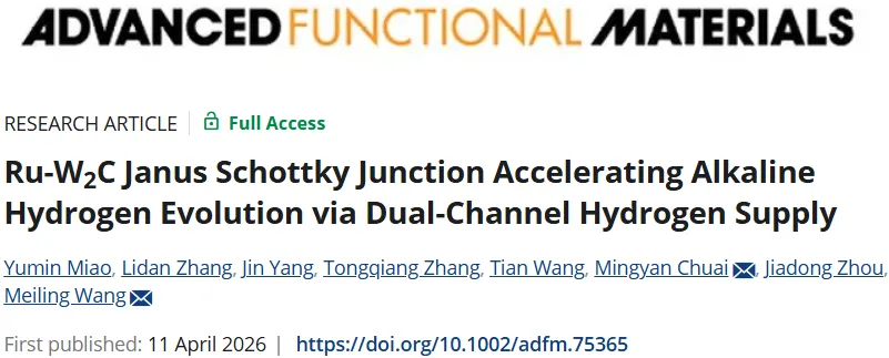 2026年04月11日,太原理工大学王美玲团队在Advanced Functional Materials期刊发表题为“Ru-W2C Janus Schottky Junction Accelerating Alkaline Hydrogen Evolution via Dual-Channel Hydrogen Supply”的研究论文,团队成员苗玉敏为论文第一作者,王美玲、吉林大学揣明艳为论文共同通讯作者。