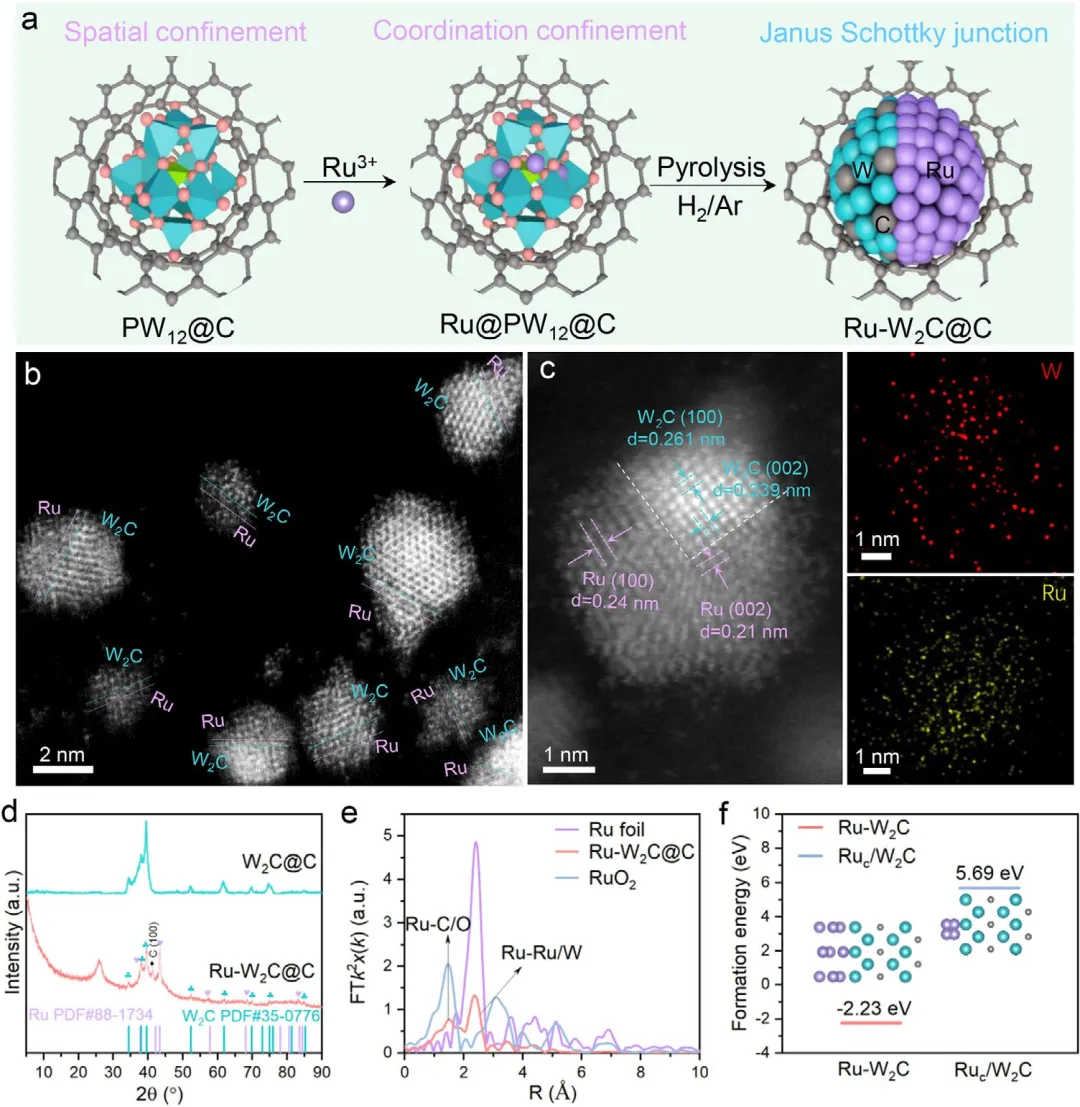 图1 Ru-W₂C@C的合成路线与结构特征。(a) Ru-W₂C@C制备过程的示意图;(b) Ru-W₂C@C的HAADF-STEM图像;(c) Ru-W₂C@C的HAADF-STEM图像及对应的EDS元素分布图;(d) XRD图谱;(e) Ru K边傅里叶变换XAS谱图;(f) Ru-W₂C和RuC/W₂C的形成能。