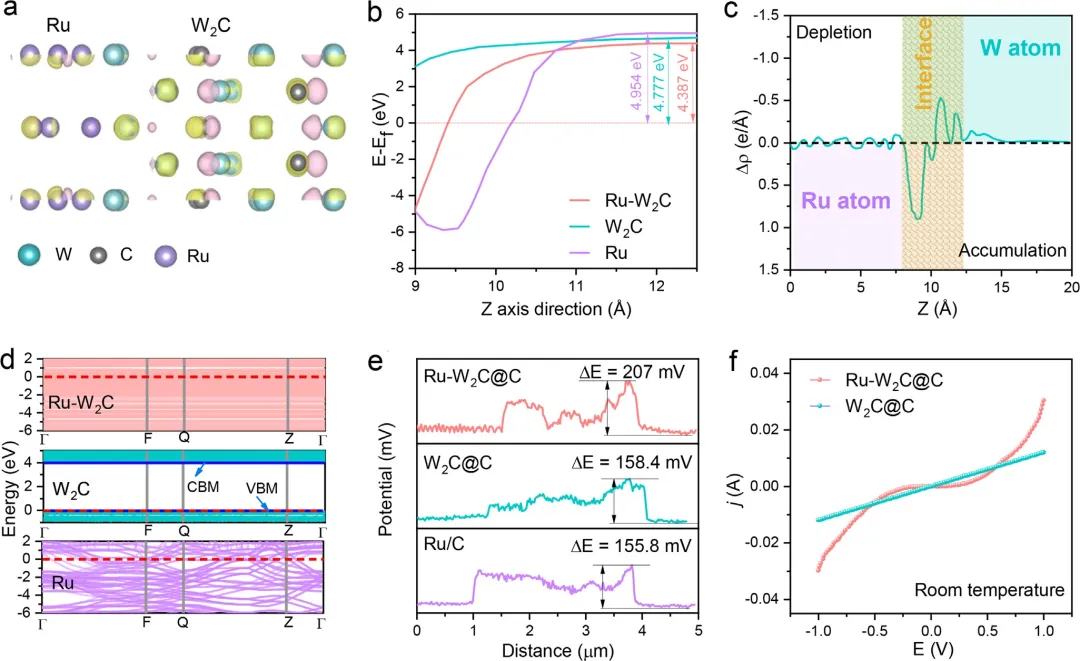图2 肖特基结的DFT辅助验证与表征。(a) 界面电荷密度差;(b) Ru-W₂C、W₂C和Ru的功函数;(c) Ru-W₂C的一维平面平均电荷密度差;(d) Ru-W₂C、W₂C和Ru的能带结构;(e) 通过KPFM测量得到的Ru-W₂C@C、W₂C@C和Ru/C的表面电势(CPD)图;(f) Ru-W₂C@C和W₂C@C的I-V曲线。