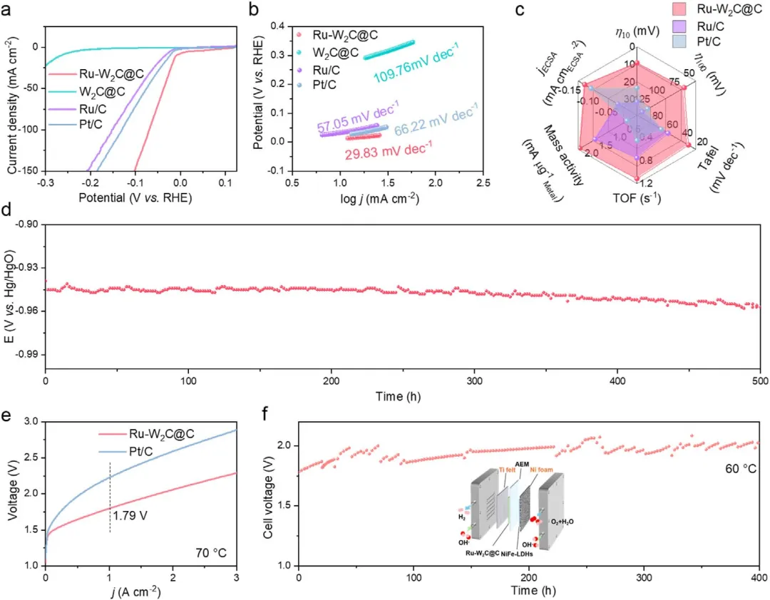图3 在1M KOH中的电化学性能和AEMWE性能。(a) Ru-W₂C@C、W₂C@C、Ru/C和Pt/C的LSV曲线;(b) Tafel曲线图;(c) 比较综合HER指标的雷达图;(d) Ru-W₂C@C的耐久性;(e) 分别以NiFe LDH、Ru-W₂C@C和Pt/C催化剂作为阳极和阴极电极,在70°C下AEMWE的LSV曲线;(f) 60°C下AEMWE的稳定性测试。