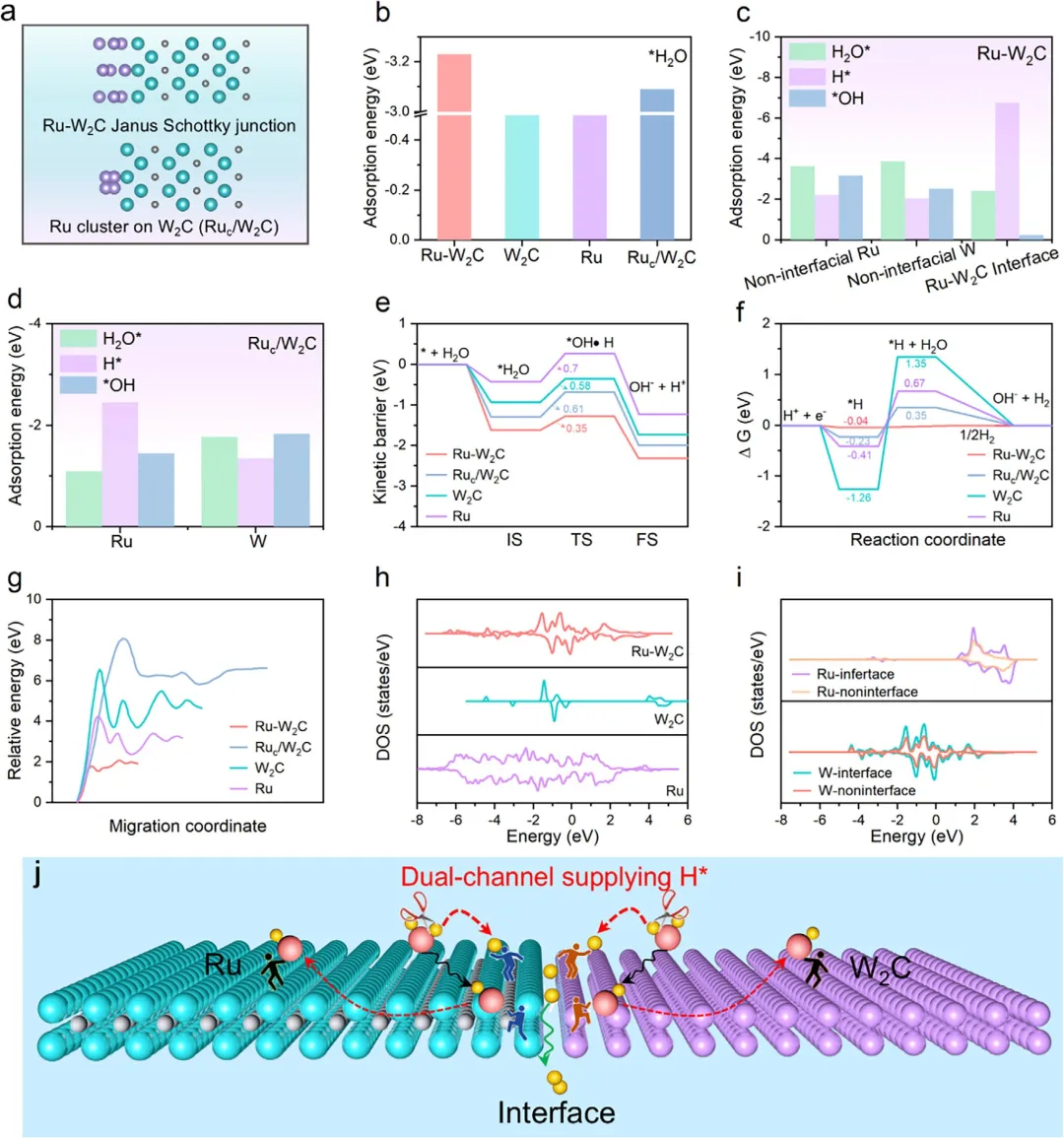 图4 HER动力学改善的理论理解。(a) Ru-W₂C和Ru-W₂C的模型;(b) H₂O*在Ru-W₂C、Ru-W₂C、W₂C和Ru上的吸附能;(c) H₂O*、OH*和H*在Ru-W₂C界面和非界面(Ru和W位点)上的吸附能;(d) Ru-W₂C中Ru和W位点对H₂O*、OH*和H*的吸附能;(e) H₂O解离的动力学能垒。IS、TS和FS分别代表初态、过渡态和终态;(f) 相对于标准氢电极的HER吉布斯自由能图;(g) 氢溢流路径图;(h) Ru-W₂C、W₂C和Ru的态密度DOS;(i) 界面和非界面区域Ru和W的局域DOS;(j) Ru-W₂C在碱性介质中HER催化机制示意图。