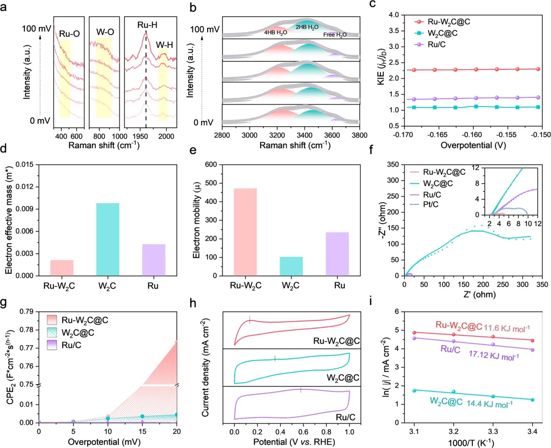 图5 Janus肖特基结加速水解离的证据。(a) Ru-W₂C@C在1M KOH中不同电位下的原位拉曼光谱;(b) 不同电位下4HB-H₂O和自由H₂O的比例变化;(c) 在1M KOH和1M KOD中测得的HER动力学同位素效应值;(d) Ru-W₂C和W₂C的电子有效质量比较;(e) Ru-W₂C和W₂C的电子迁移率比较;(f) Ru-W₂C@C、W₂C@C和Ru/C在−0.1V(vs RHE)下的Nyquist图;(g) Ru-W₂C Janus肖特基结用于碱性HER的双通道H*供应机制示意图。