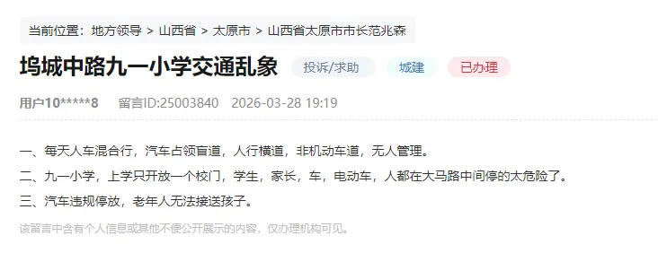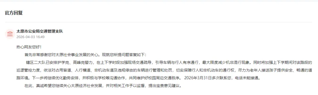 太原市公安局交通管理支队明确回复: 辖区二大队已安排护学岗、高峰岗警力,在上下学时段加强现场交通疏导,引导车辆与行人有序通行,最大限度减少机非混行现象。同时将加强上下学期间对该路段的巡逻管控力度,依法对占用盲道、人行横道、非机动车道及违规停放的车辆进行管理和处罚,切实保障行人和非机动车的通行权,尽力为老年人接送孩子提供安全、畅通的道路环境。下一步将继续优化勤务安排,并积极与学校等沟通协作,共同维护好校园周边交通秩序。