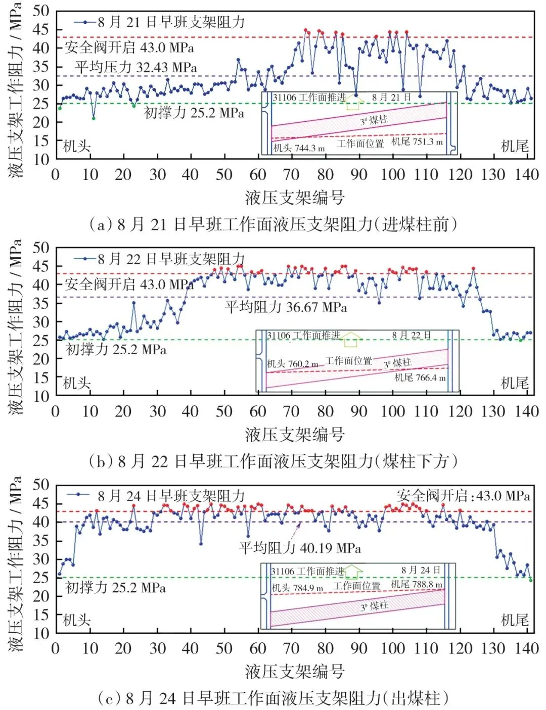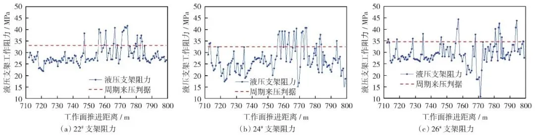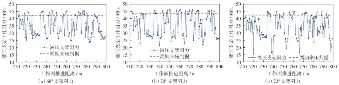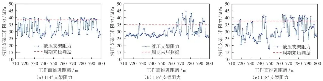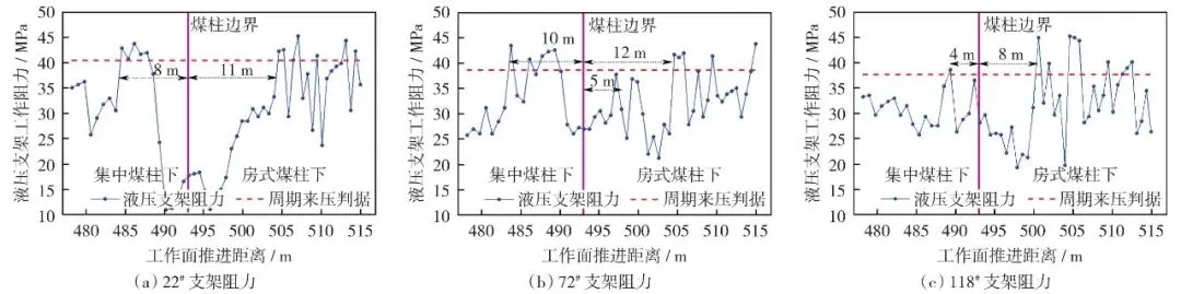 图6 31106工作面过煤柱期间不同位置液压支架工作阻力