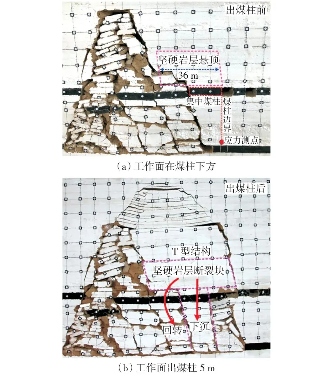 2) 工作面出煤柱时,上覆岩层“T型结构”失稳发生整体的回转下沉运动,引起3-1号煤层的老顶叠加同步破断,相比出煤柱之前应力涨幅达到70.4%,揭示了工作面出煤柱的强矿压机理。