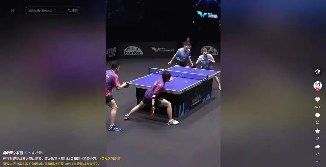 开局两人就憋足了劲,衔接速度快到离谱,黄友政的反手拧拉又快又狠,石洵瑶的正手进攻精准犀利,防守也十分稳固,完全压制住对手的节奏。