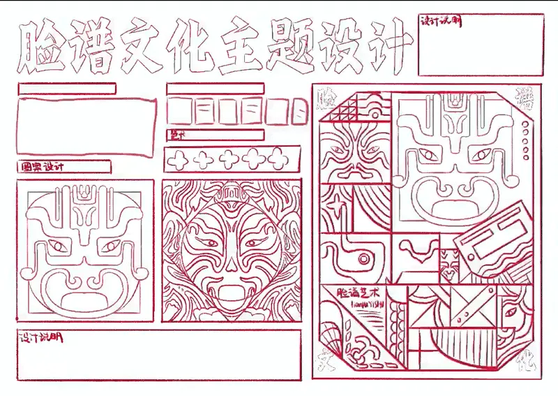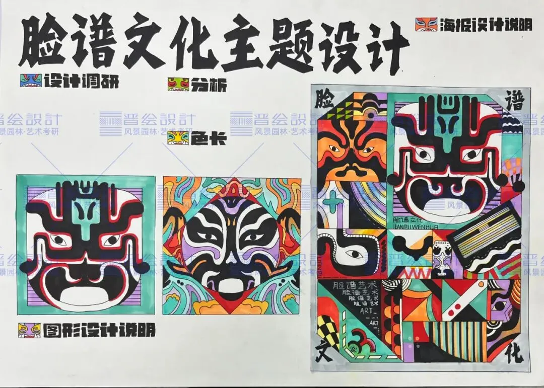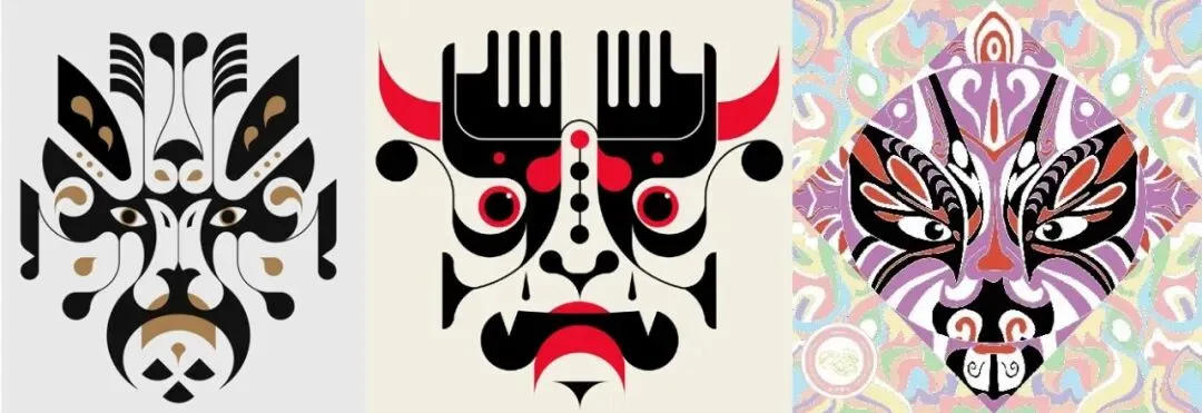 素材转换|首先是确定构图,好的构图需要同时具备文字、图形、版式,既规整又有新意。其次是选择元素,戏曲脸谱图案、相关表情、传统纹样元素等,按主题分类填入布局块面。最后细节推敲,加入与版式、元素、画风相符合的字体,完善设计方案。